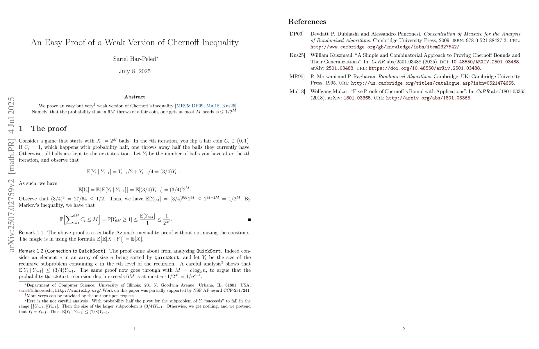 We prove an easy but very weak version of Chernoff inequality. Namely, that the probability that in $6M$ throws of a fair coin, one gets at most $M$ heads is $\leq 1/2^M$.