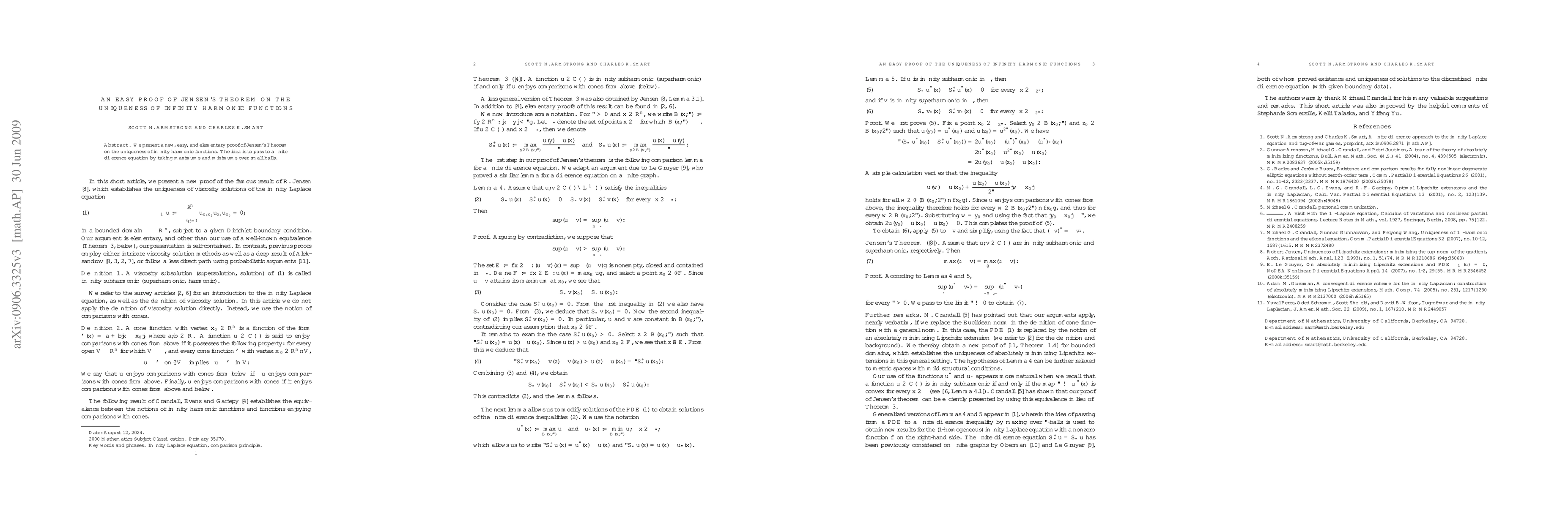 Summary: This paper provides a straightforward proof of Jensen's theorem on the uniqueness of infinity harmonic functions, utilizing a finite difference approach through maximums and minimums over small balls. The method simplifies the original proof significantly.