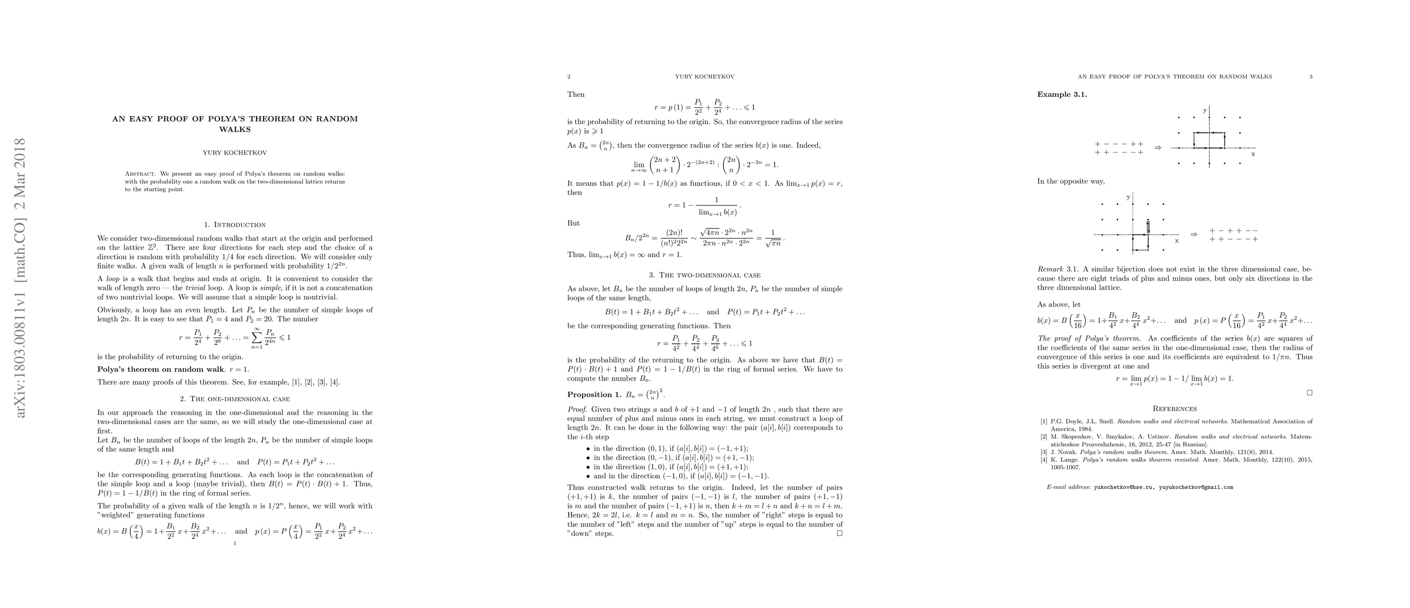 Summary: This paper provides a straightforward proof of Polya's theorem, demonstrating that a random walk on a two-dimensional lattice will almost surely return to its starting point. The proof simplifies the understanding of this fundamental result in random walk theory.