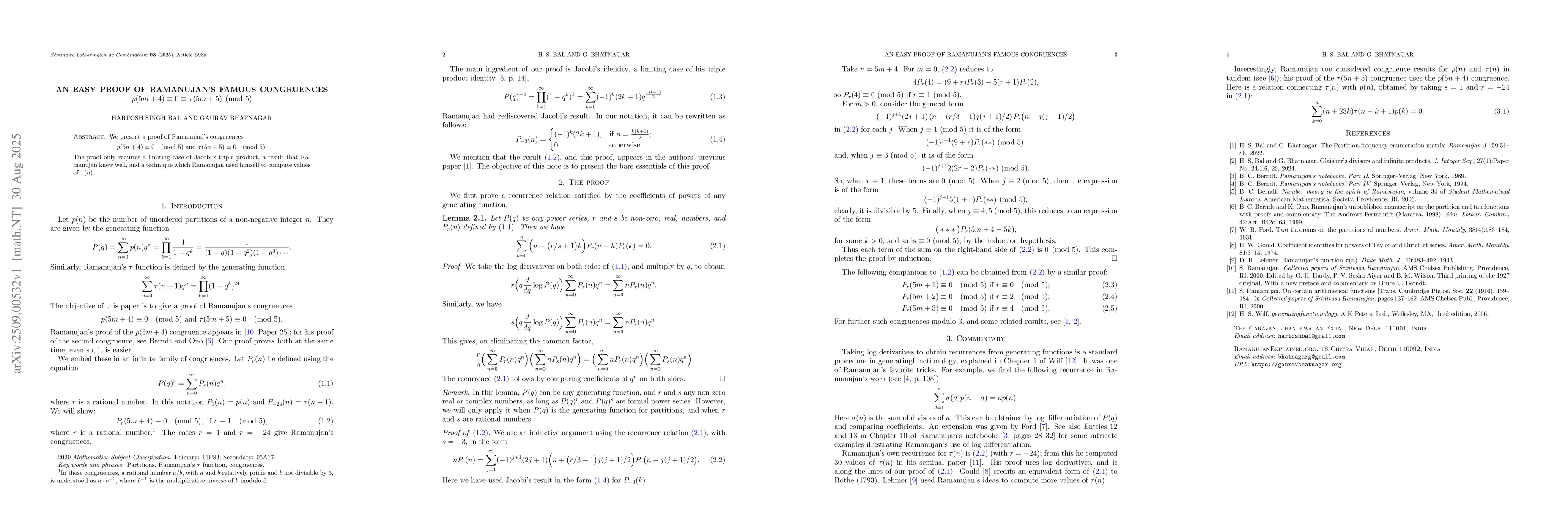 We present a proof of Ramanujan's congruences $$p(5n+4) \equiv 0 \pmod 5 \text{ and } \tau(5n+5) \equiv 0 \pmod 5.$$ The proof only requires a limiting case of Jacobi's triple product, a result that Ramanujan knew well, and a technique which Ramanujan used himself to compute values of $\tau(n)$.