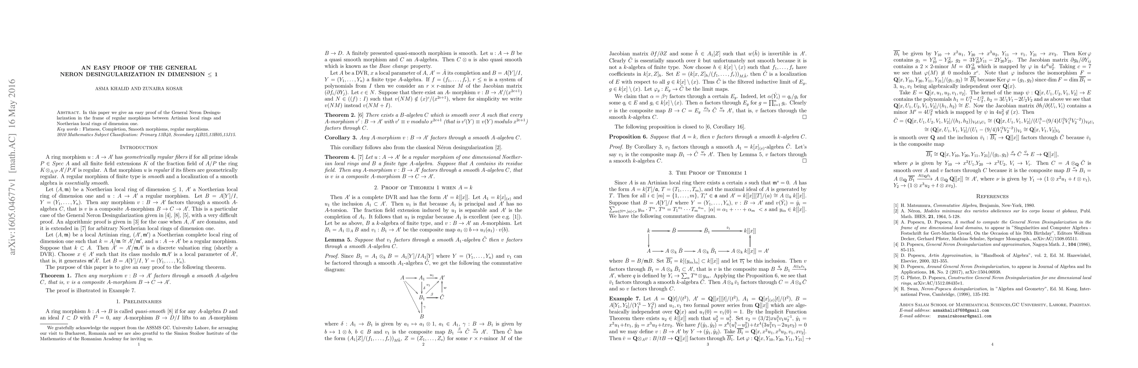 In this paper we give an easy proof of the general Neron desingularization in the frame of regular morphism between Artinian local rings and Noetherian local rings of dimension one.