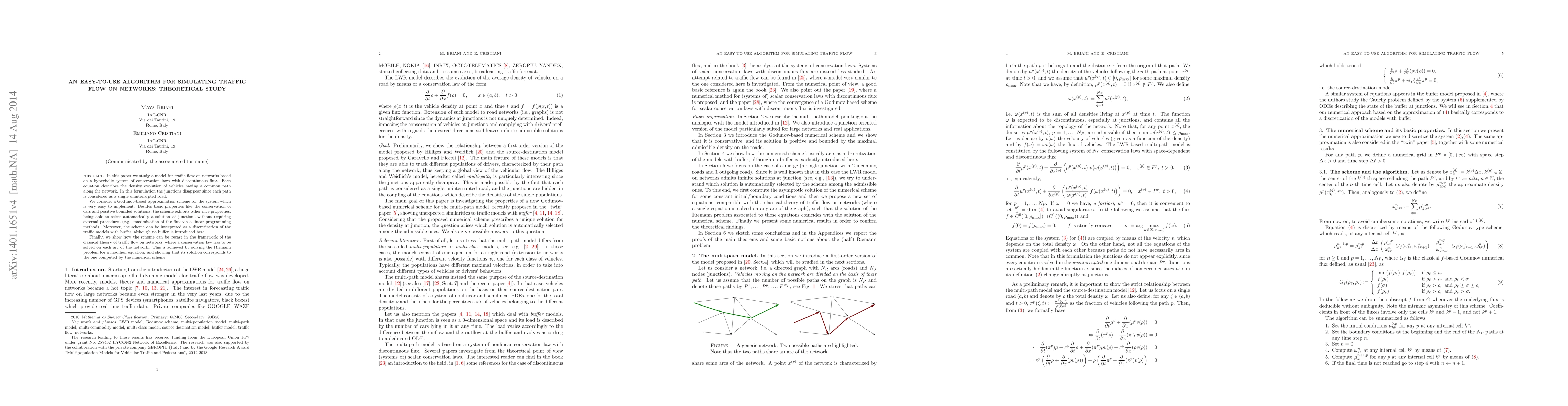 In this paper we study a model for traffic flow on networks based on a hyperbolic system of conservation laws with discontinuous flux. Each equation describes the density evolution of vehicles having a common path along the network. In this formulation the junctions apparently disappear since each path is considered as a single uninterrupted road. We consider a Godunov-based approximation scheme for the system which is very easy to implement. Besides basic properties like the conservation of cars and positive bounded solutions, the scheme exhibits nice properties, being able to select automatically a reasonable solution at junctions without requiring external procedures (e.g., maximization of the flux via a linear programming method). Moreover, the scheme can be interpreted as a discretization of the traffic models with buffer, although any buffer is introduced here. Finally, we show how the scheme can be recast in the framework of the classical theory of traffic flow on networks, where a conservation law has to be solved on each arc of the network. This is achieved by solving the Riemann problem for a modified equation, and showing that its solution corresponds to the one computed by the numerical scheme.