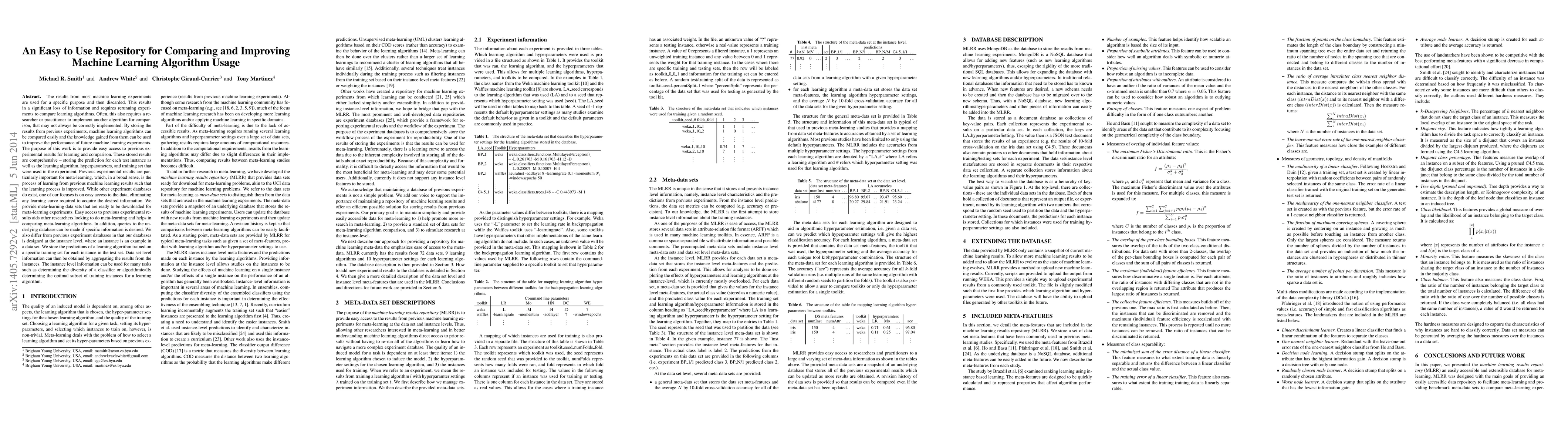 The results from most machine learning experiments are used for a specific purpose and then discarded. This results in a significant loss of information and requires rerunning experiments to compare learning algorithms. This also requires implementation of another algorithm for comparison, that may not always be correctly implemented. By storing the results from previous experiments, machine learning algorithms can be compared easily and the knowledge gained from them can be used to improve their performance. The purpose of this work is to provide easy access to previous experimental results for learning and comparison. These stored results are comprehensive -- storing the prediction for each test instance as well as the learning algorithm, hyperparameters, and training set that were used. Previous results are particularly important for meta-learning, which, in a broad sense, is the process of learning from previous machine learning results such that the learning process is improved. While other experiment databases do exist, one of our focuses is on easy access to the data. We provide meta-learning data sets that are ready to be downloaded for meta-learning experiments. In addition, queries to the underlying database can be made if specific information is desired. We also differ from previous experiment databases in that our databases is designed at the instance level, where an instance is an example in a data set. We store the predictions of a learning algorithm trained on a specific training set for each instance in the test set. Data set level information can then be obtained by aggregating the results from the instances. The instance level information can be used for many tasks such as determining the diversity of a classifier or algorithmically determining the optimal subset of training instances for a learning algorithm.