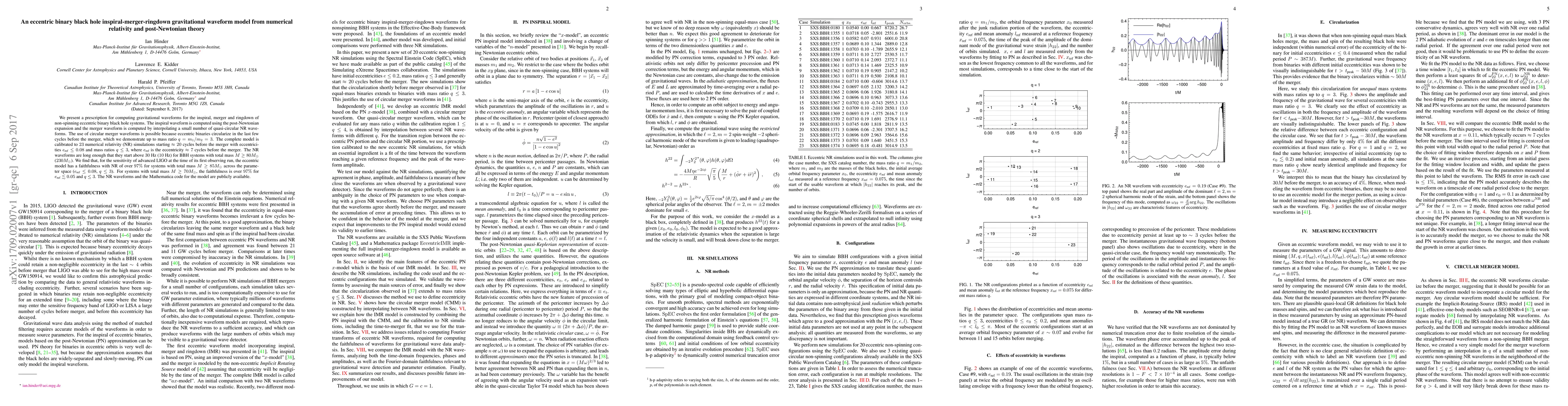 This paper introduces a gravitational waveform model for eccentric binary black hole inspiral-merger-ringdown events, combining post-Newtonian theory for the inspiral and numerical relativity for the merger. The model is calibrated to 23 numerical relativity simulations and shows high fidelity with numerical relativity data for advanced LIGO's sensitivity.