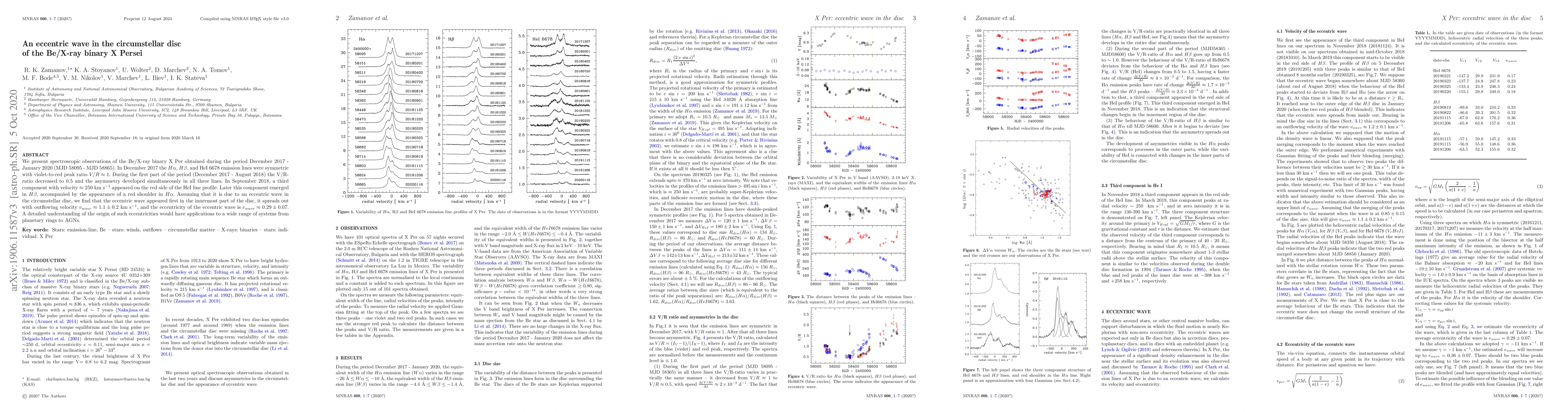 We present spectroscopic observations of the Be/X-ray binary X Per obtained during the period December 2017 - January 2020 (MJD~58095 - MJD~58865). In December 2017 the $H\alpha$, $H\beta$, and HeI 6678 emission lines were symmetric with violet-to-red peak ratio $V/R \approx 1$. During the first part of the period (December 2017 - August 2018) the V/R-ratio decreased to 0.5 and the asymmetry developed simultaneously in all three lines. In September 2018, a third component with velocity $\approx 250$~km~s$^{-1}$ appeared on the red side of the HeI line profile. Later this component emerged in $H\beta$, accompanied by the appearance of a red shoulder in $H\alpha$. Assuming that it is due to an eccentric wave in the circumstellar disc, we find that the eccentric wave appeared first in the innermost part of the disc, it spreads out with outflowing velocity $v_{wave} \approx 1.1 \pm 0.2 $~km~s$^{-1}$, and the eccentricity of the eccentric wave is $e_{wave} \approx 0.29 \pm 0.07$. A detailed understanding of the origin of such eccentricities would have applications to a wide range of systems from planetary rings to AGNs.