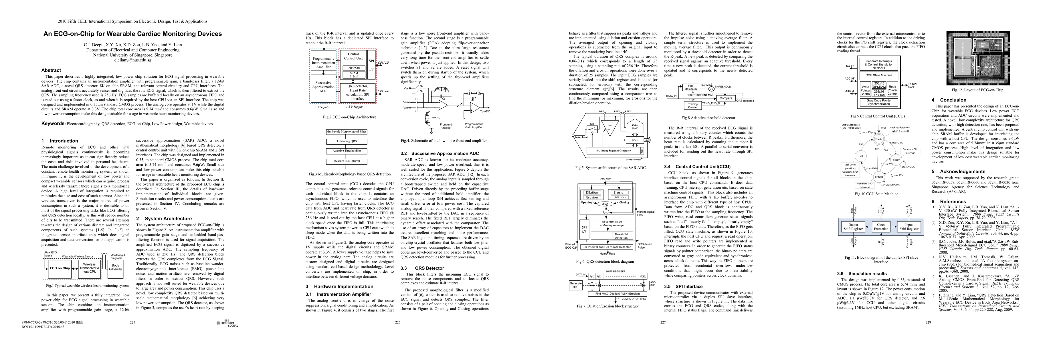 This paper presents an integrated, low-power ECG-on-chip for wearable cardiac monitoring, featuring an instrumentation amplifier, band-pass filter, SAR ADC, and a novel QRS detector, all designed in a 0.35um CMOS process, consuming just 9.6uW and suitable for continuous heart monitoring.