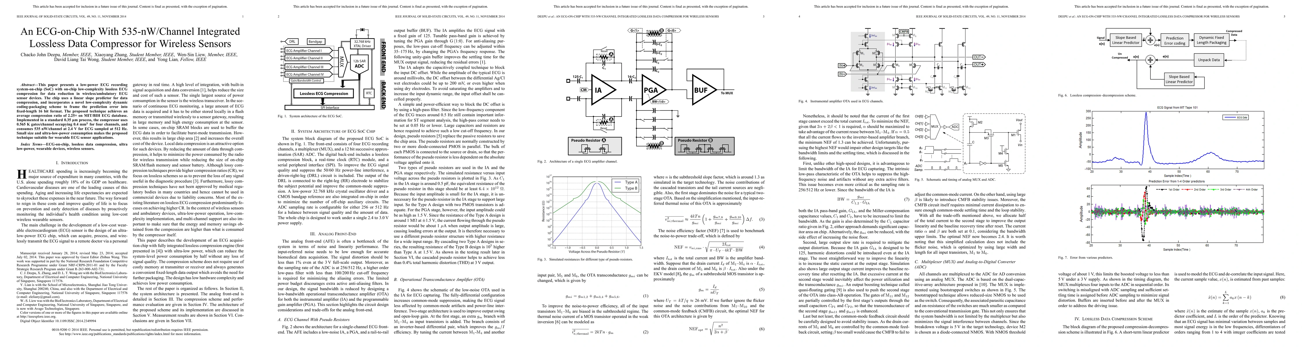 This paper introduces a low-power ECG-on-chip system with integrated lossless data compression for wireless ECG sensors, utilizing a linear slope predictor and a novel dynamic coding scheme to achieve a 2.25x compression ratio, consuming only 535 nW/channel. The design is compact and suitable for wearable ECG applications.