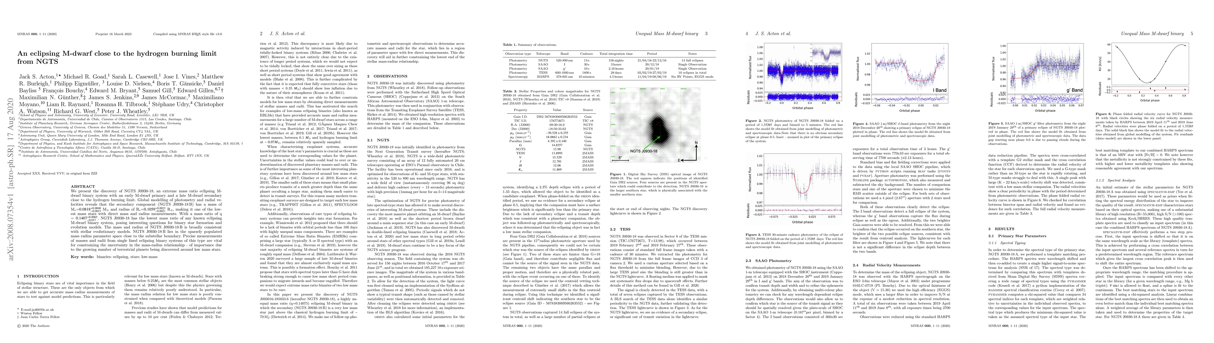 The paper reports the discovery of NGTS J0930-18, an eclipsing M-dwarf binary with an extremely low mass secondary component close to the hydrogen burning limit. The secondary star has a mass of 0.0818 solar masses and a radius of 0.1059 solar radii, making it one of the lowest mass stars with direct measurements, which is crucial for refining the mass-radius relationship for low-mass stars.