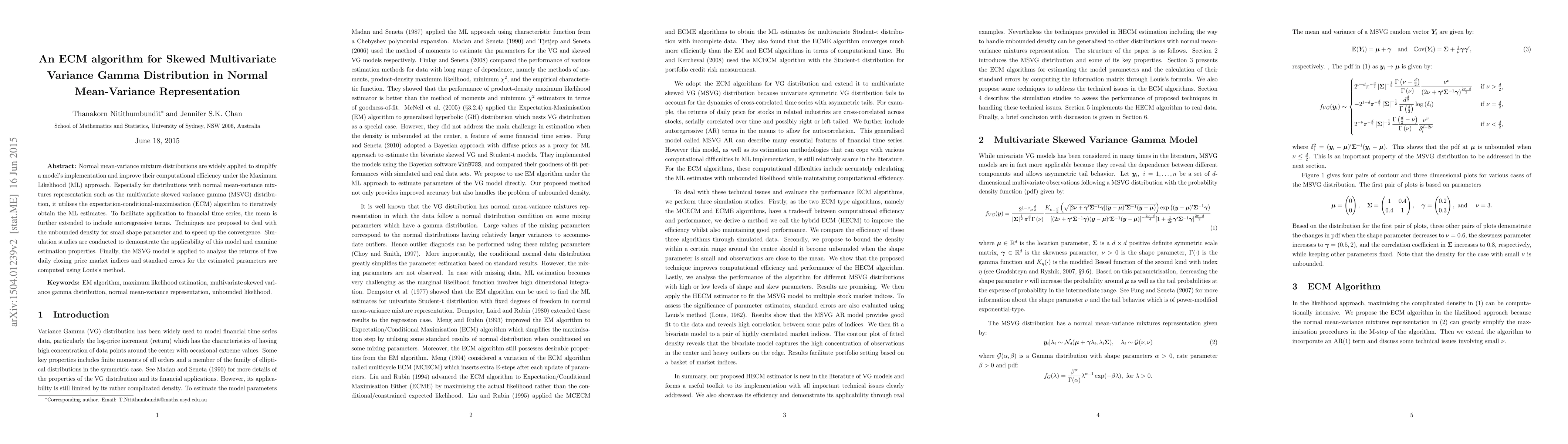 Normal mean-variance mixture distributions are widely applied to simplify a model's implementation and improve their computational efficiency under the Maximum Likelihood (ML) approach. Especially for distributions with normal mean-variance mixtures representation such as the multivariate skewed variance gamma (MSVG) distribution, it utilises the expectation-conditional-maximisation (ECM) algorithm to iteratively obtain the ML estimates. To facilitate application to financial time series, the mean is further extended to include autoregressive terms. Techniques are proposed to deal with the unbounded density for small shape parameter and to speed up the convergence. Simulation studies are conducted to demonstrate the applicability of this model and examine estimation properties. Finally, the MSVG model is applied to analyse the returns of five daily closing price market indices and standard errors for the estimated parameters are computed using Louis's method.