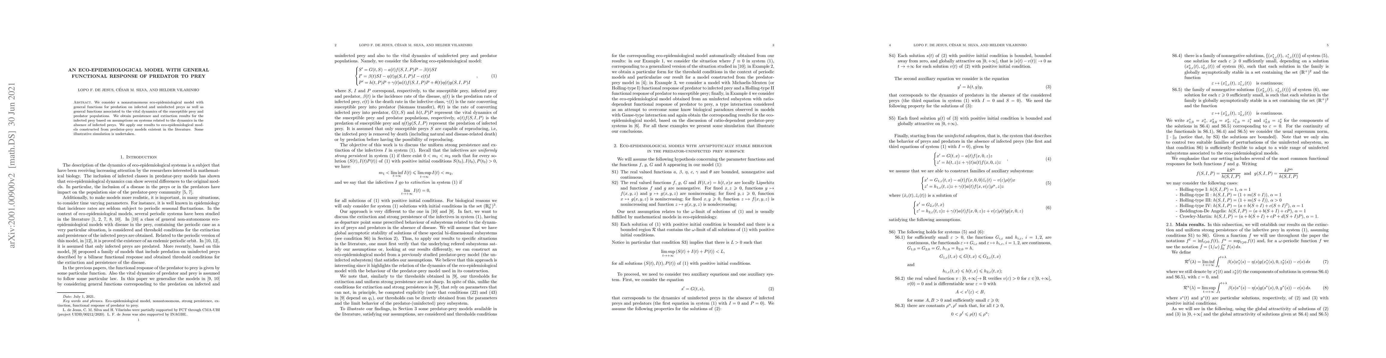 This paper develops a nonautonomous eco-epidemiological model with general functional responses for predator-prey interactions and vital dynamics. It derives persistence and extinction results for infected prey populations, applying these findings to existing predator-prey models and providing illustrative simulations.