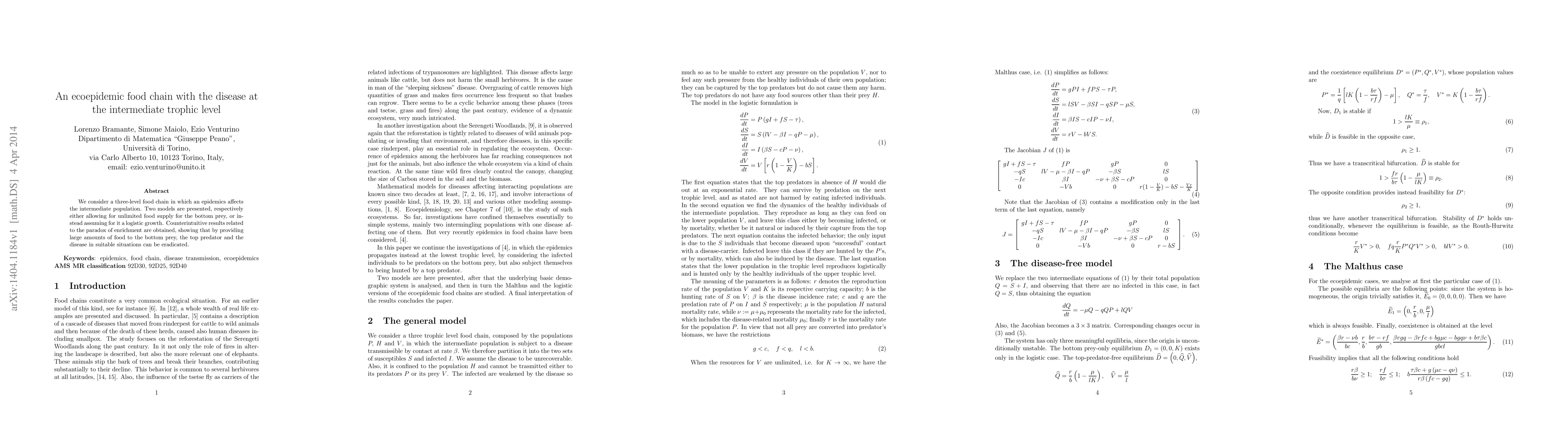 This research explores a three-level food chain where an epidemic impacts the intermediate species. It presents two models: one with unlimited food supply for the bottom prey and another with logistic growth, revealing counterintuitive outcomes where ample food for the bottom prey can eradicate the top predator and disease under certain conditions.