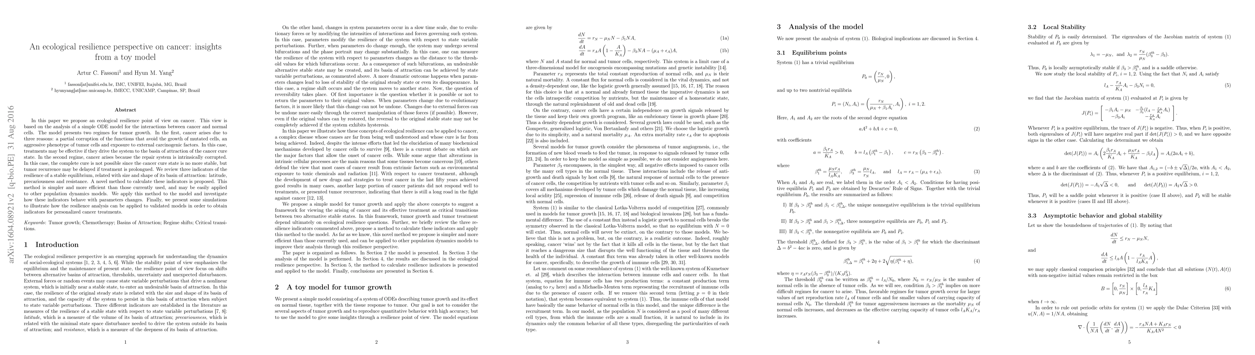 This paper explores cancer from an ecological resilience perspective using a simple ODE model to analyze interactions between cancer and normal cells, identifying two regimes for tumor growth and proposing a novel method for calculating resilience indicators. The study suggests that treatments may delay tumor recurrence by altering the system's stability.