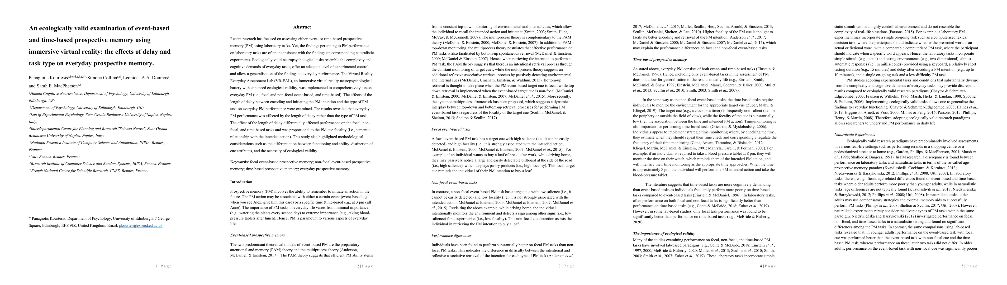 This research utilizes immersive virtual reality to examine how delay and task type impact everyday prospective memory. Findings indicate that delay length, rather than task type, significantly affects performance across focal and non-focal event-based and time-based prospective memory tasks, with greater effects seen for more semantically related cues.