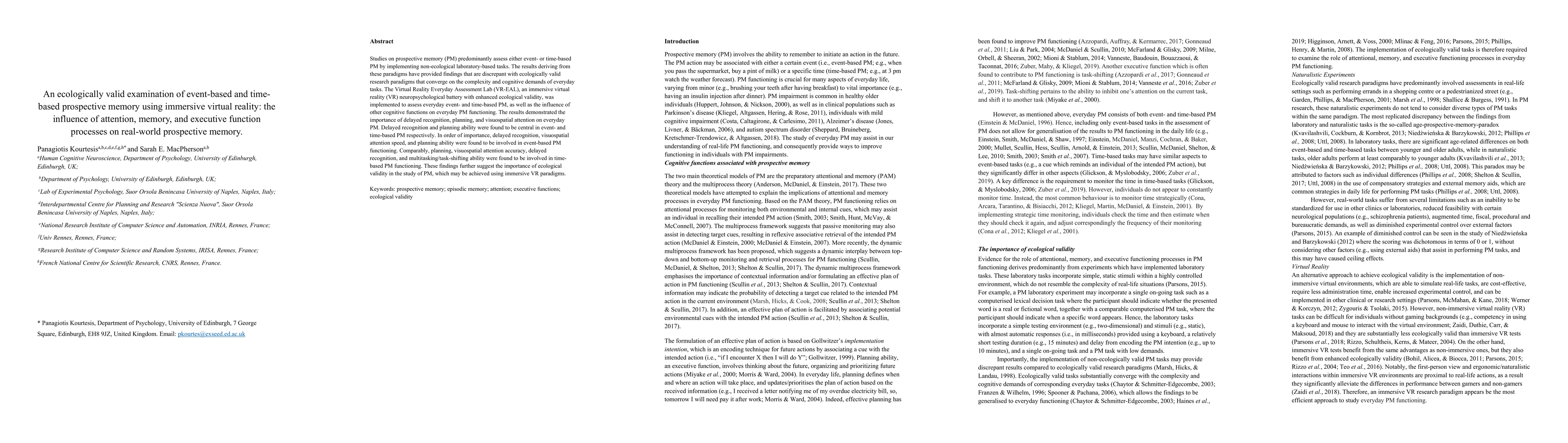 This study uses immersive virtual reality to assess event-based and time-based prospective memory in ecologically valid settings, finding that delayed recognition and planning are crucial for these tasks. The research highlights the importance of cognitive functions like attention and executive processes in everyday prospective memory performance.