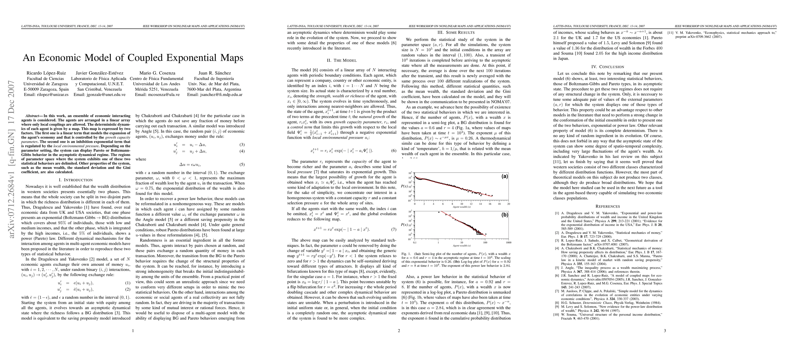 In this work, an ensemble of economic interacting agents is considered. The agents are arranged in a linear array where only local couplings are allowed. The deterministic dynamics of each agent is given by a map. This map is expressed by two factors. The first one is a linear term that models the expansion of the agent's economy and that is controlled by the {\it growth capacity parameter}. The second one is an inhibition exponential term that is regulated by the {\it local environmental pressure}. Depending on the parameter setting, the system can display Pareto or Boltzmann-Gibbs behavior in the asymptotic dynamical regime. The regions of parameter space where the system exhibits one of these two statistical behaviors are delimited. Other properties of the system, such as the mean wealth, the standard deviation and the Gini coefficient, are also calculated.