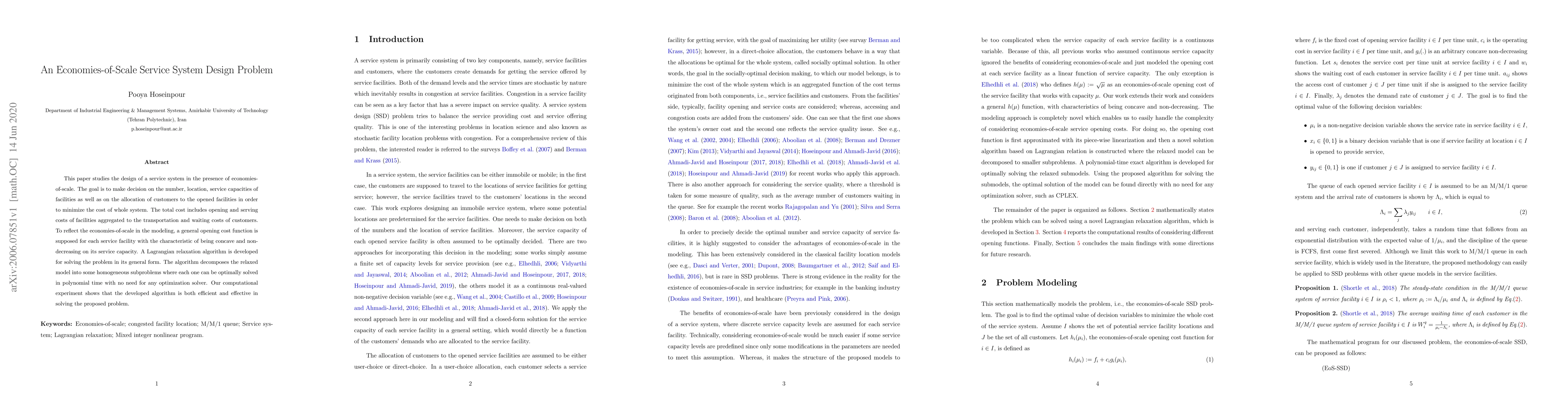 This paper addresses the design of service systems considering economies-of-scale, optimizing facility locations, capacities, and customer allocations to minimize total costs. A Lagrangian relaxation algorithm is developed to solve the problem efficiently, demonstrating effectiveness in computational experiments.
