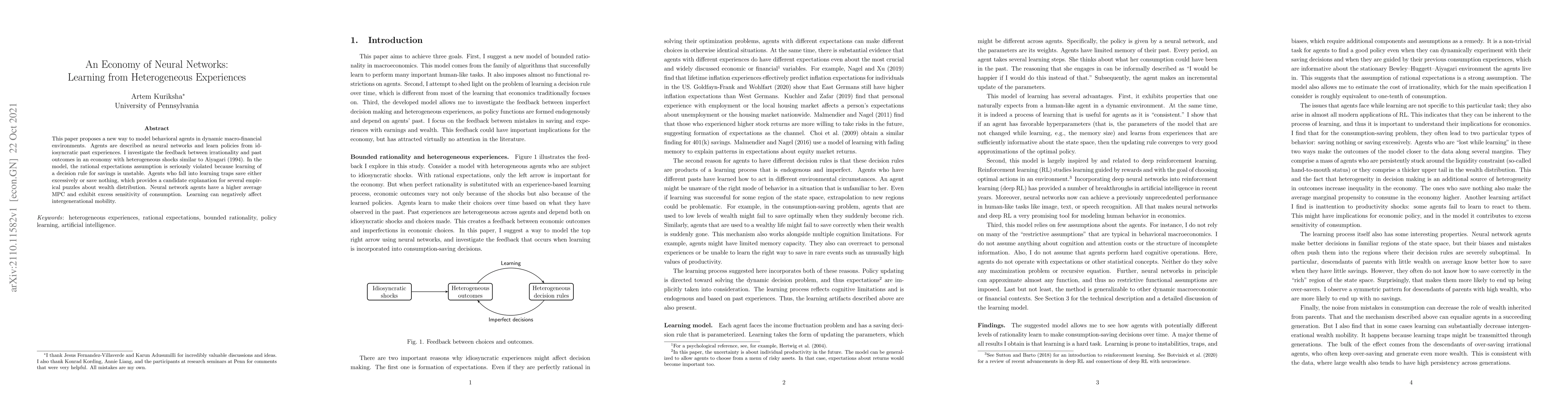 This paper proposes a new way to model behavioral agents in dynamic macro-financial environments. Agents are described as neural networks and learn policies from idiosyncratic past experiences. I investigate the feedback between irrationality and past outcomes in an economy with heterogeneous shocks similar to Aiyagari (1994). In the model, the rational expectations assumption is seriously violated because learning of a decision rule for savings is unstable. Agents who fall into learning traps save either excessively or save nothing, which provides a candidate explanation for several empirical puzzles about wealth distribution. Neural network agents have a higher average MPC and exhibit excess sensitivity of consumption. Learning can negatively affect intergenerational mobility.
