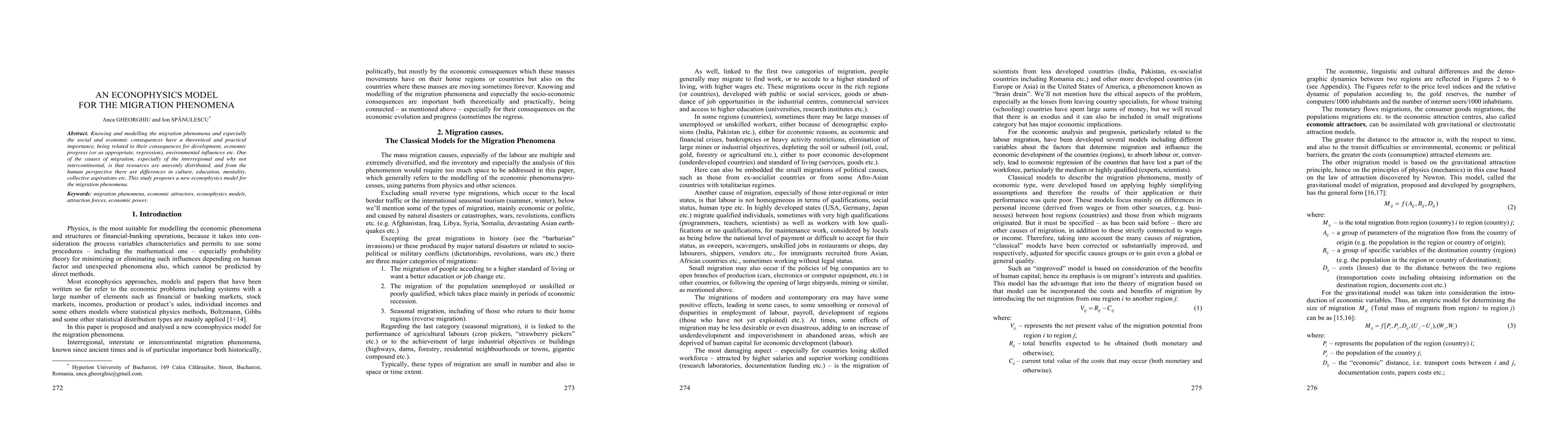 Knowing and modelling the migration phenomena and especially the social and economic consequences have a theoretical and practical importance, being related to their consequences for development, economic progress (or as appropriate, regression), environmental influences etc. One of the causes of migration, especially of the interregional and why not intercontinental, is that resources are unevenly distributed, and from the human perspective there are differences in culture, education, mentality, collective aspirations etc. This study proposes a new econophysics model for the migration phenomena.