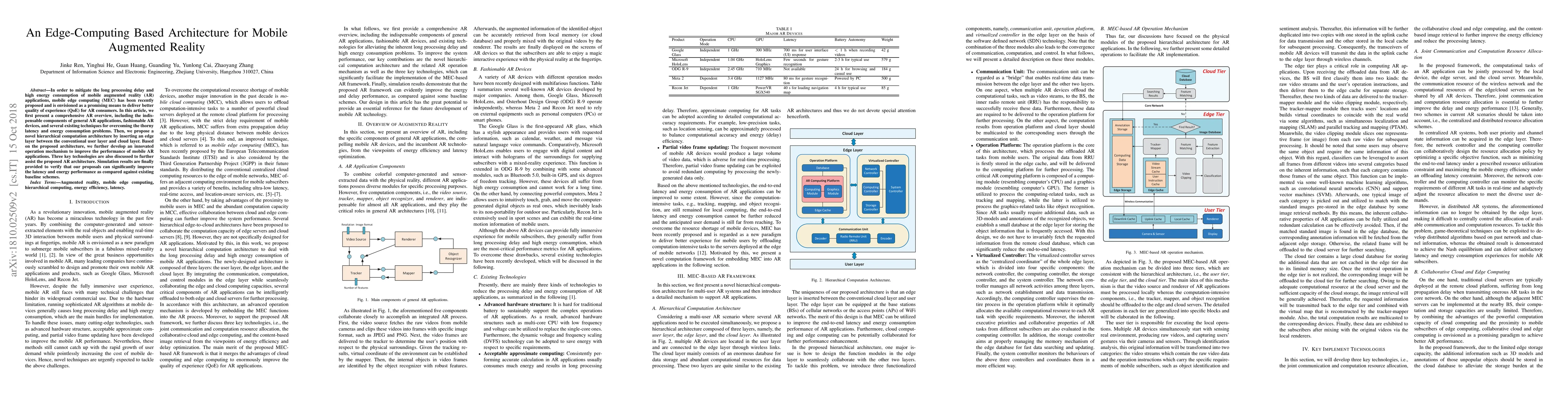 This paper proposes a mobile edge computing-based architecture to enhance the performance of mobile augmented reality (AR) applications by reducing latency and energy consumption. The architecture introduces an edge layer between the user and cloud layers, along with an innovative operation mechanism, and is supported by three key technologies. Simulation results demonstrate significant improvements over existing methods.