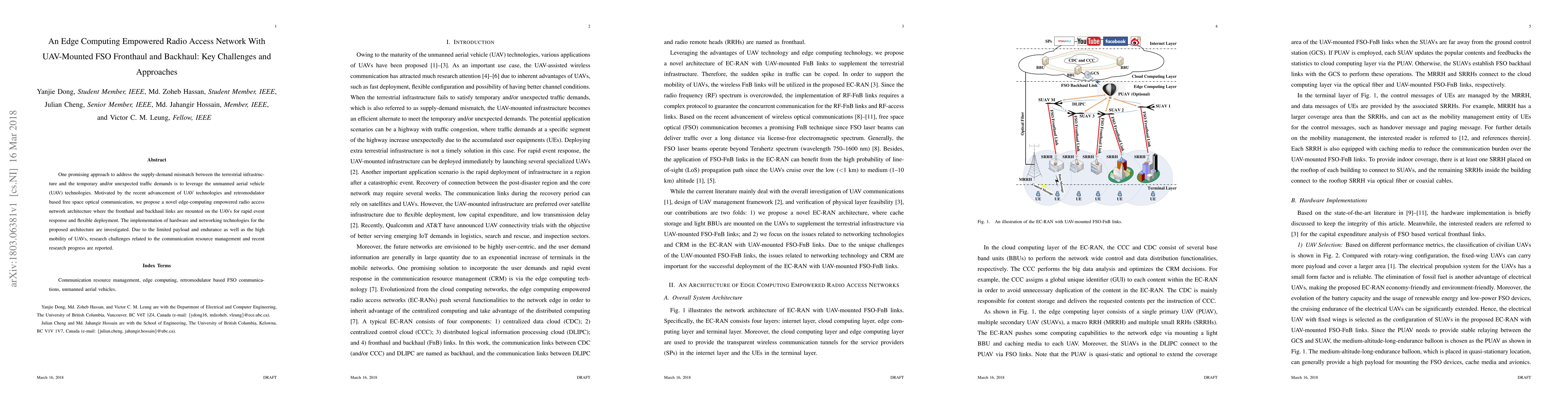 One promising approach to address the supply-demand mismatch between the terrestrial infrastructure and the temporary and/or unexpected traffic demands is to leverage the unmanned aerial vehicle (UAV) technologies. Motivated by the recent advancement of UAV technologies and retromodulator based free space optical communication, we propose a novel edge-computing empowered radio access network architecture where the fronthaul and backhaul links are mounted on the UAVs for rapid event response and flexible deployment. The implementation of hardware and networking technologies for the proposed architecture are investigated. Due to the limited payload and endurance as well as the high mobility of UAVs, research challenges related to the communication resource management and recent research progress are reported.