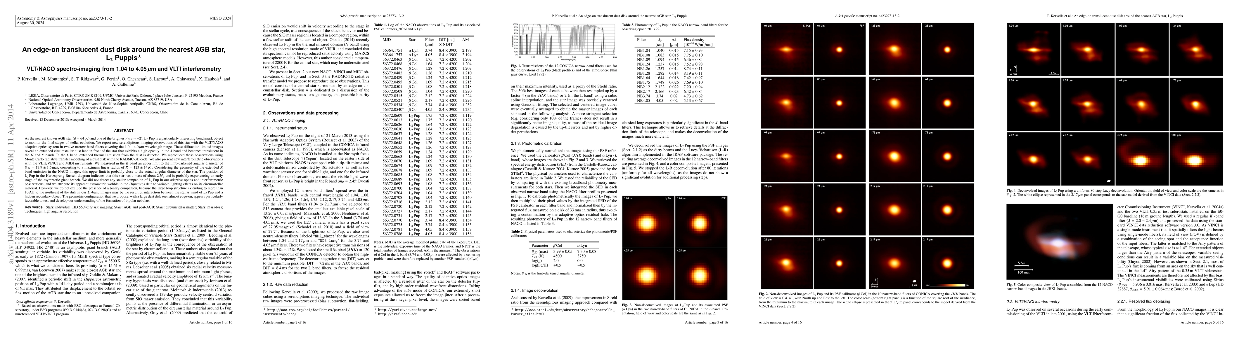 As the nearest known AGB star (d=64pc) and one of the brightest (mK-2), L2 Pup is a particularly interesting benchmark object to monitor the final stages of stellar evolution. We report new lucky imaging observations of this star with the VLT/NACO adaptive optics system in twelve narrow band filters covering the 1.0-4.0 microns wavelength range. These diffraction limited images reveal an extended circumstellar dust lane in front of the star, that exhibits a high opacity in the J band and becomes translucent in the H and K bands. In the L band, extended thermal emission from the dust is detected. We reproduce these observations using Monte-Carlo radiative transfer modeling of a dust disk with the RADMC-3D code. We also present new interferometric observations with the VLTI/VINCI and MIDI instruments. We measure in the K band an upper limit to the limb-darkened angular diameter of theta_LD = 17.9 +/- 1.6 mas, converting to a maximum linear radius of R = 123 +/- 14 Rsun. Considering the geometry of the extended K band emission in the NACO images, this upper limit is probably close to the actual angular diameter of the star. The position of L2 Pup in the Herzsprung-Russell diagram indicates that this star has a mass around 2 Msun and is probably experiencing an early stage of the asymptotic giant branch. We do not detect any stellar companion of L2 Pup in our adaptive optics and interferometric observations, and we attribute its apparent astrometric wobble in the Hipparcos data to variable lighting effects on its circumstellar material. We however do not exclude the presence of a binary companion, as the large loop structure extending to more than 10 AU to the North-East of the disk in our L band images may be the result of interaction between the stellar wind of L2 Pup and a hidden secondary object. The geometric configuration that we propose, with a large dust disk seen almost edge-on, appears particularly favorable to test and develop our understanding of the formation of bipolar nebulae.