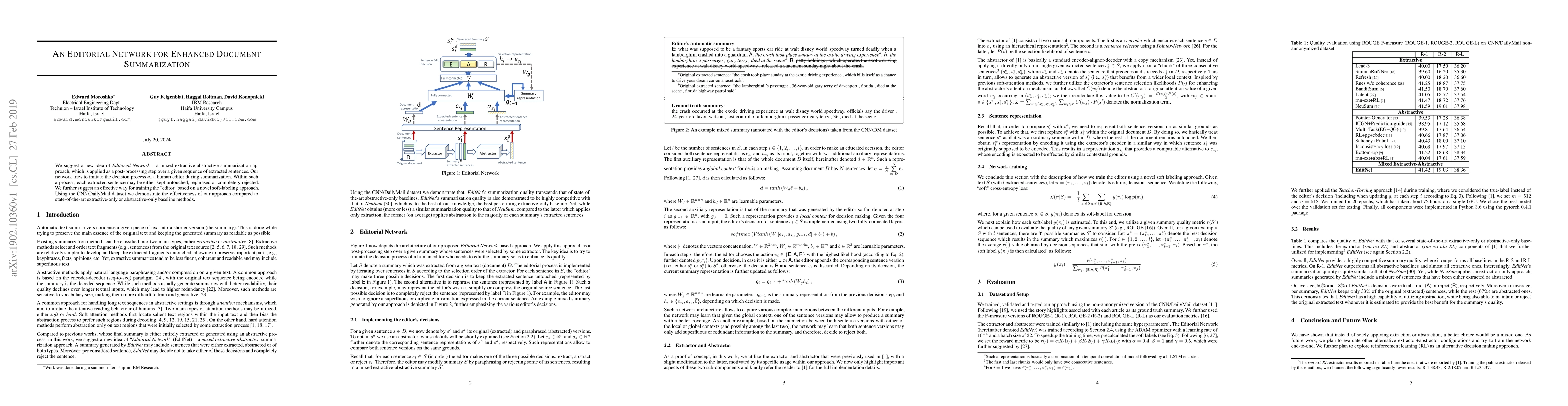 This paper proposes an Editorial Network for enhanced document summarization, which combines extractive and abstractive methods to mimic a human editor's decision process. It demonstrates the effectiveness of its approach using the CNN/DailyMail dataset, outperforming state-of-the-art methods.