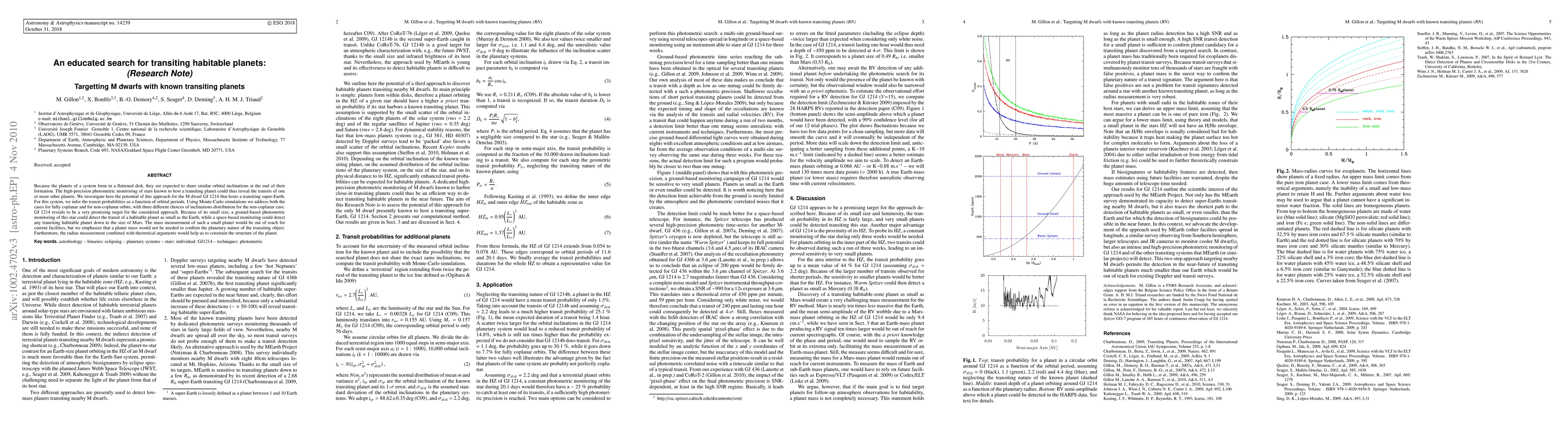 Because the planets of a system form in a flattened disk, they are expected to share similar orbital inclinations at the end of their formation. The high-precision photometric monitoring of stars known to host a transiting planet could thus reveal the transits of one or more other planets. We investigate here the potential of this approach for the M dwarf GJ 1214 that hosts a transiting super-Earth. For this system, we infer the transit probabilities as a function of orbital periods. Using Monte-Carlo simulations we address both the cases for fully coplanar and for non-coplanar orbits, with three different choices of inclinations distribution for the non-coplanar case. GJ 1214 reveals to be a very promising target for the considered approach. Because of its small size, a ground-based photometric monitoring of this star could detect the transit of a habitable planet as small as the Earth, while a space-based monitoring could detect any transiting habitable planet down to the size of Mars. The mass measurement of such a small planet would be out of reach for current facilities, but we emphasize that a planet mass would not be needed to confirm the planetary nature of the transiting object. Furthermore, the radius measurement combined with theoretical arguments would help us to constrain the structure of the planet.