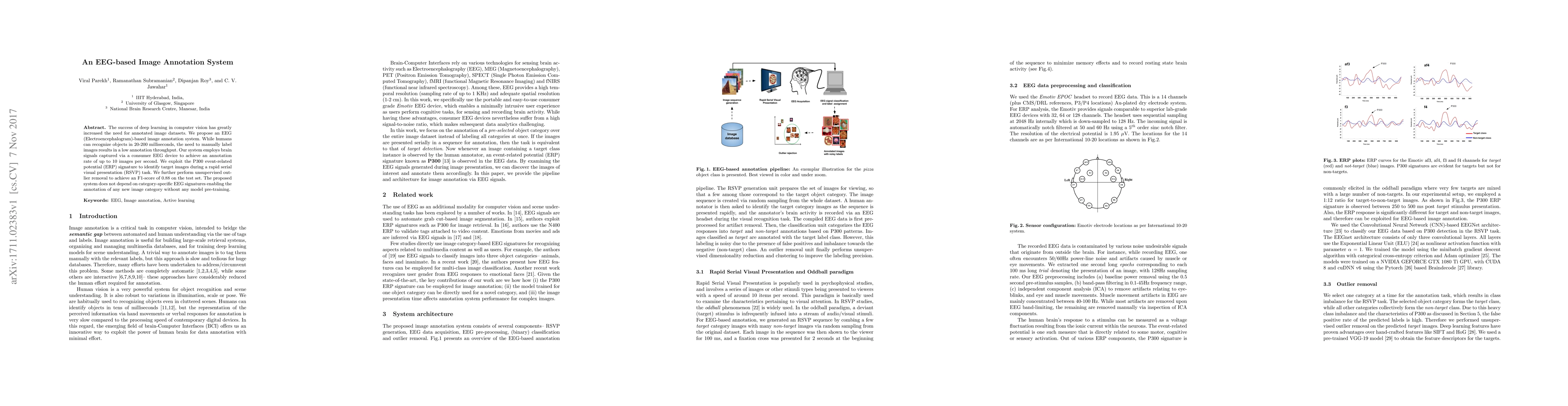 This paper proposes an EEG-based system to annotate images rapidly using brain signals, achieving up to 10 images per second by leveraging P300 event-related potentials during an RSVP task, and achieving an F1-score of 0.88 with unsupervised outlier removal. The system is versatile, not requiring category-specific EEG signatures for new image categories.