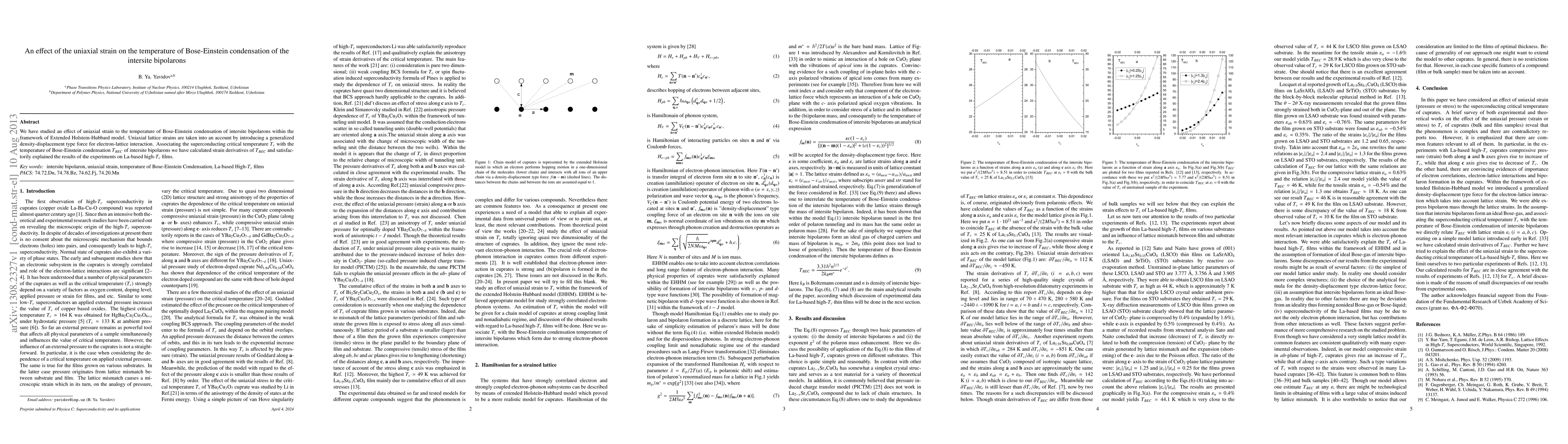 We have studied an effect of uniaxial strain to the temperature of Bose-Einstein condensation of intersite bipolarons within the framework of Extended Holstein-Hubbard model. Uniaxial lattice strains are taken into an account by introducing a generalized density-displacement type force for electron-lattice interaction. Associating the superconducting critical temperature $T_c$ with the temperature of Bose-Einstein condensation $T_{BEC}$ of intersite bipolarons we have calculated strain derivatives of $T_{BEC}$ and satisfactorily explained the results of the experiments on La-based high-$T_c$ films.