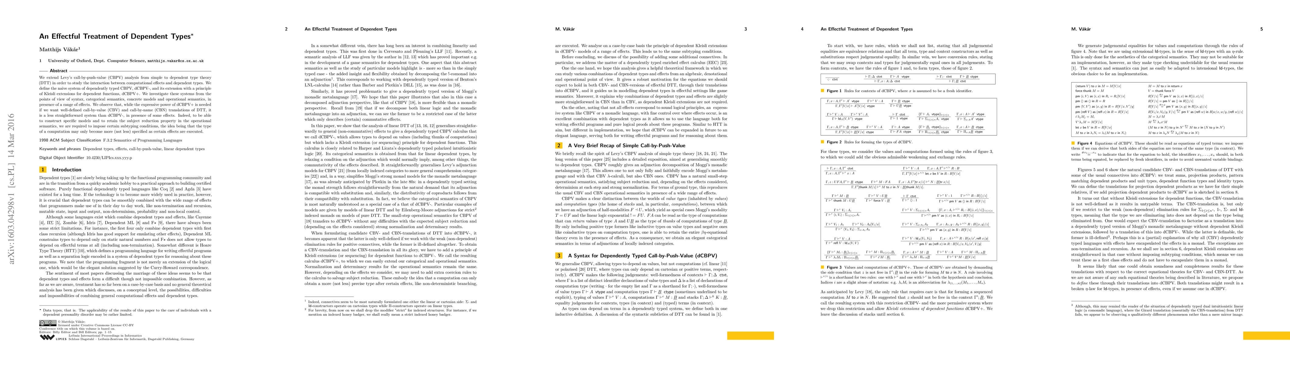 The paper presents an effectful treatment of dependent types by extending Levy's CBPV analysis to DTT, defining dCBPV- and dCBPV+, and providing their categorical semantics, concrete models, and operational semantics.
