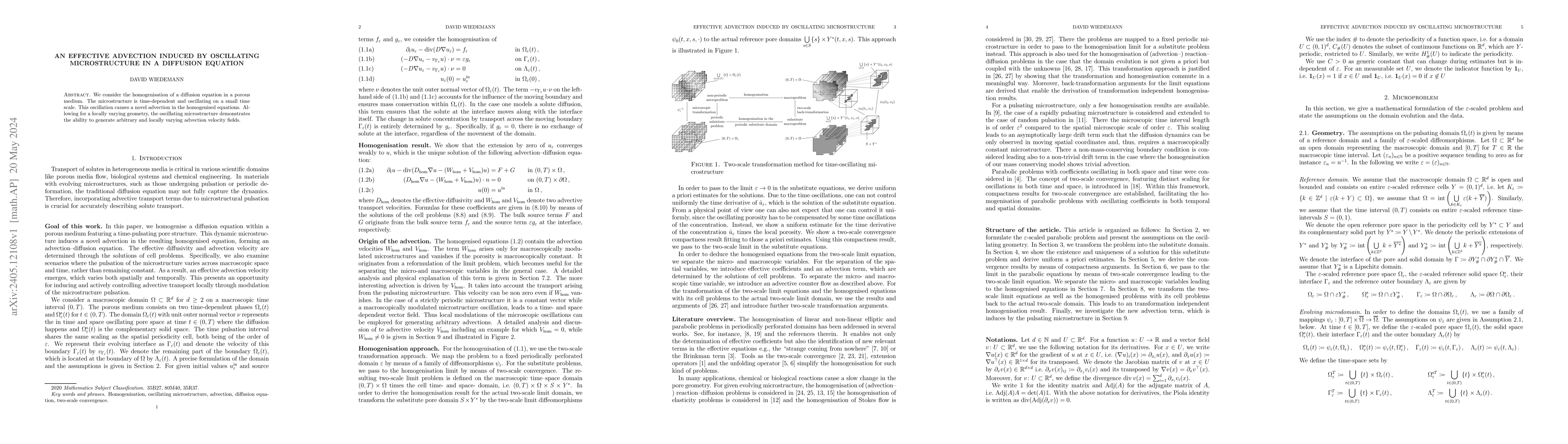 Two-line summary: This research investigates the homogenization of a diffusion equation in a porous medium where the microstructure oscillates on a small time scale, leading to a novel form of advection in the homogenized equations. The oscillating microstructure can generate locally varying and arbitrary advection velocity fields due to its changing geometry.