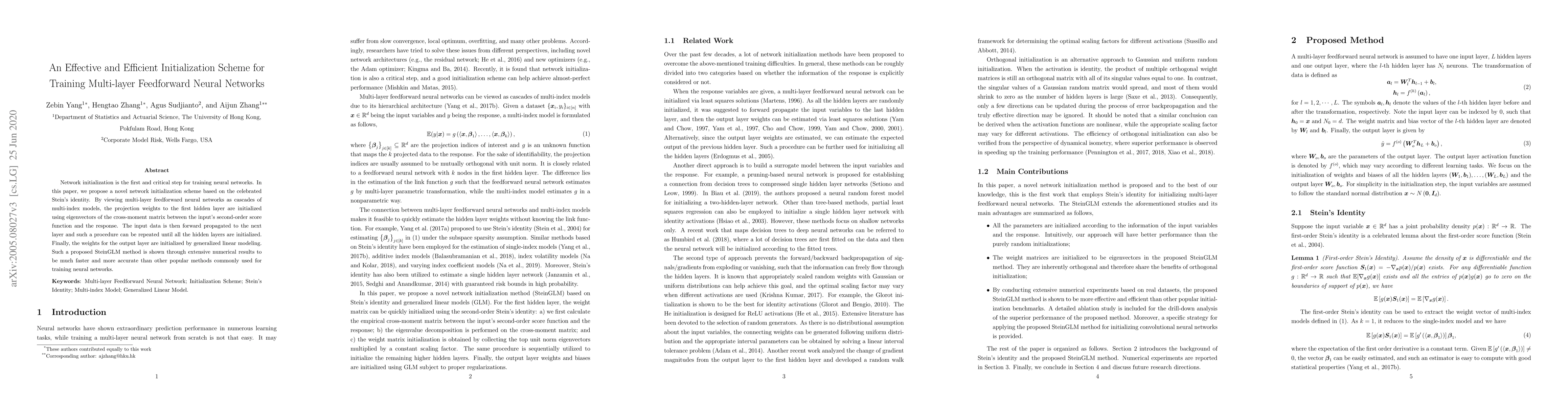 This paper introduces a novel initialization scheme, SteinGLM, for training multi-layer feedforward neural networks, utilizing Stein's identity and eigenvectors of cross-moment matrices. The method is faster and more accurate than existing initialization techniques, as demonstrated by numerical results.