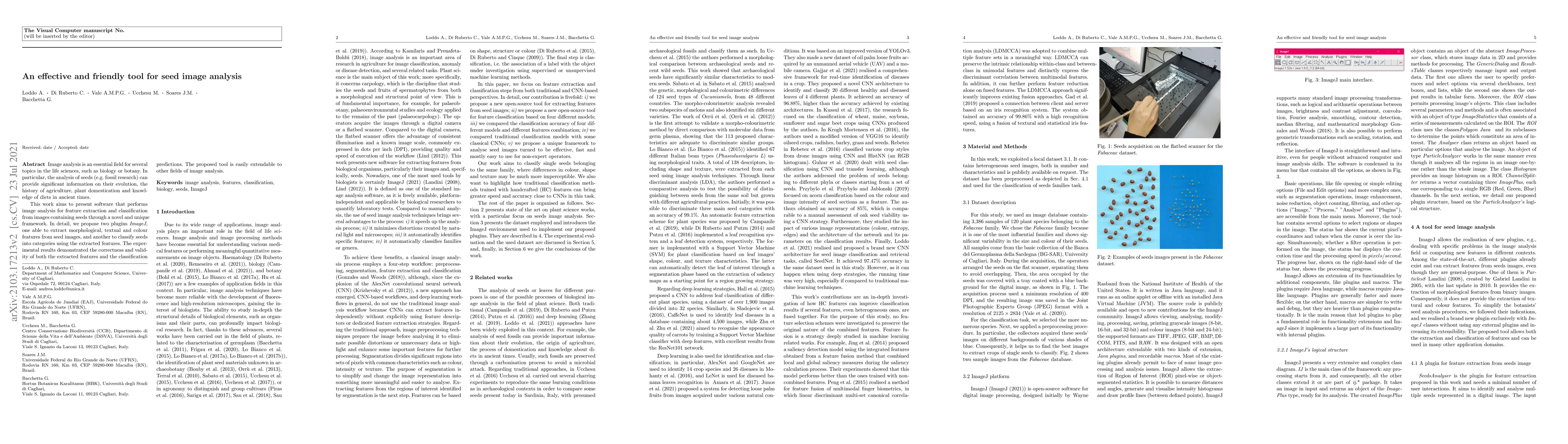 Image analysis is an essential field for several topics in the life sciences, such as biology or botany. In particular, the analysis of seeds (e.g. fossil research) can provide significant information on their evolution, the history of agriculture, plant domestication and knowledge of diets in ancient times. This work aims to present software that performs image analysis for feature extraction and classification from images containing seeds through a novel and unique framework. In detail, we propose two plugins \emph{ImageJ}, one able to extract morphological, textual and colour features from seed images, and another to classify seeds into categories using the extracted features. The experimental results demonstrated the correctness and validity of both the extracted features and the classification predictions. The proposed tool is easily extendable to other fields of image analysis.