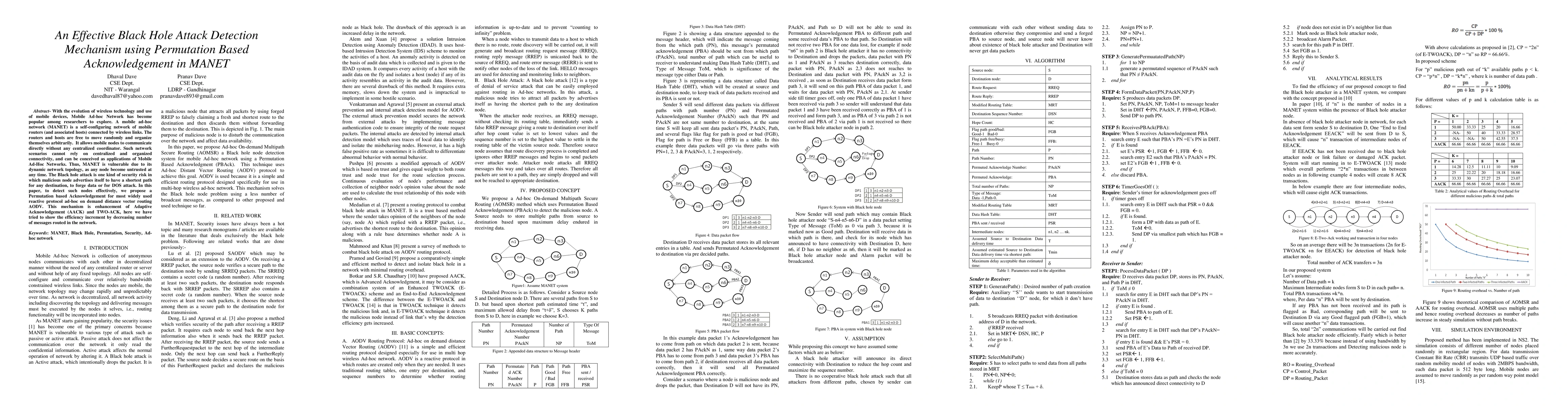 With the evolution of wireless technology and use of mobile devices, Mobile Ad-hoc Network has become popular among researchers to explore. A mobile ad-hoc network (MANET) is a self-configuring network of mobile routers (and associated hosts) connected by wireless links. The routers and hosts are free to move randomly and organize themselves arbitrarily. It allows mobile nodes to communicate directly without any centralized coordinator. Such network scenarios cannot rely on centralized and organized connectivity, and can be conceived as applications of Mobile Ad-Hoc Networks. Thus, MANET is vulnerable due to its dynamic network topology, as any node become untrusted at any time. The Black hole attack is one kind of security risk in which malicious node advertises itself to have a shortest path for any destination, to forge data or for DOS attack. In this paper, to detect such nodes effectively, we propose a Permutation based Acknowledgement for most widely used reactive protocol ad-hoc on demand distance vector routing AODV. This mechanism is enhancement of Adaptive Acknowledgement (AACK) and TWO-ACK, here we have tried to show the efficiency increment by decreasing number of messages routed in the network.