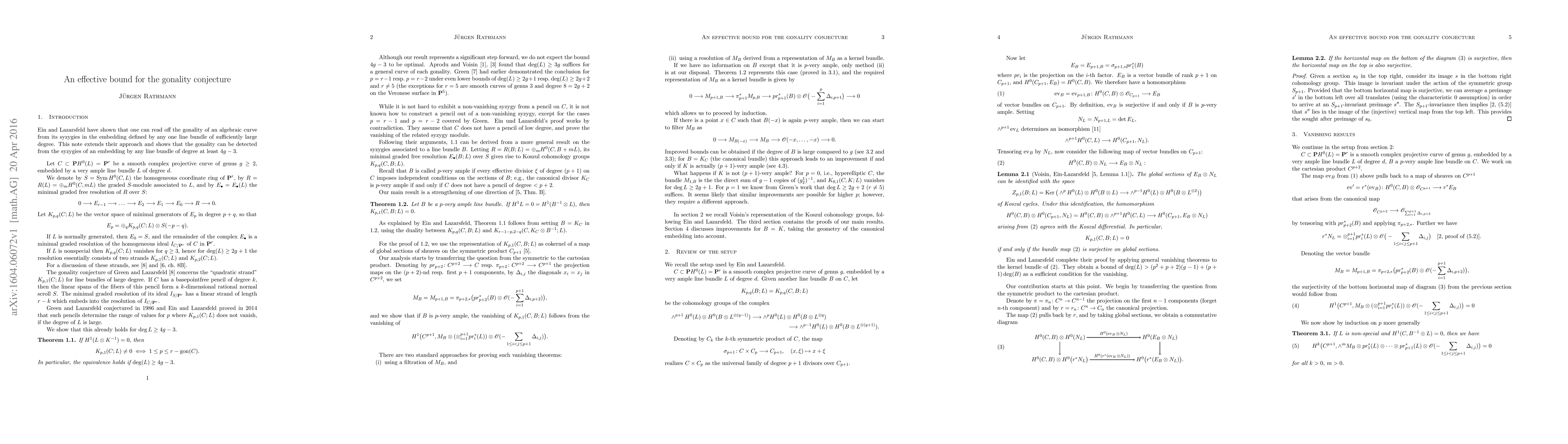 Researchers extend a previous finding to show that gonality can be detected from line bundle syzygies of degree at least 4g-3, building on earlier work by Ein and Lazarsfeld.