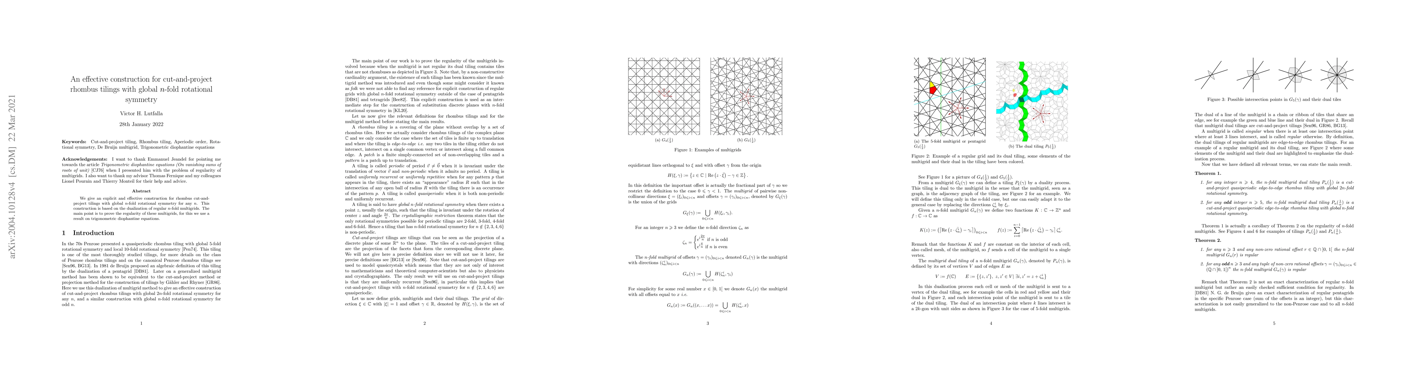 We give an explicit and effective construction for rhombus cut-and-project tilings with global n-fold rotational symmetry for any n. This construction is based on the dualization of regular n-fold multigrids. The main point is to prove the regularity of these multigrids, for this we use a result on trigonometric diophantine equations.