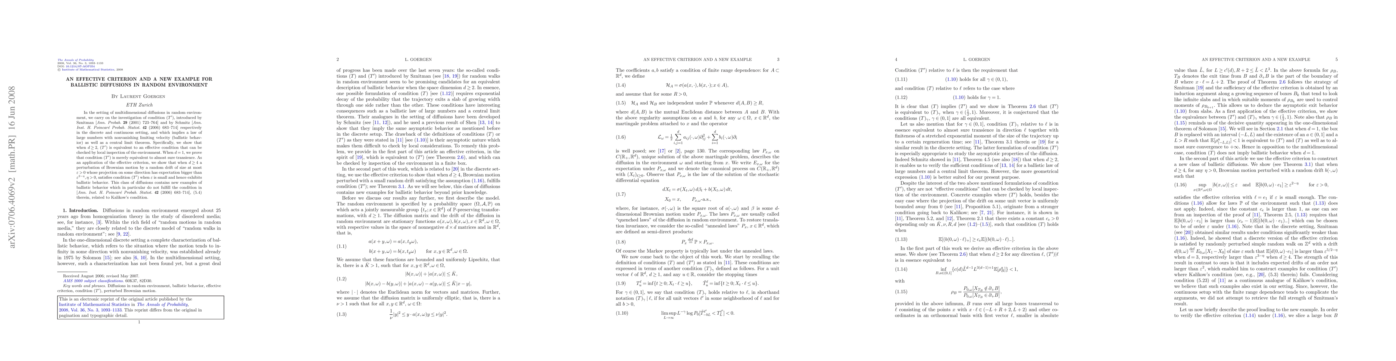 In the setting of multidimensional diffusions in random environment, we carry on the investigation of condition $(T')$, introduced by Sznitman [Ann. Probab. 29 (2001) 723--764] and by Schmitz [Ann. Inst. H. Poincar\'{e} Probab. Statist. 42 (2006) 683--714] respectively in the discrete and continuous setting, and which implies a law of large numbers with nonvanishing limiting velocity (ballistic behavior) as well as a central limit theorem. Specifically, we show that when $d\geq2$, $(T')$ is equivalent to an effective condition that can be checked by local inspection of the environment. When $d=1$, we prove that condition $(T')$ is merely equivalent to almost sure transience. As an application of the effective criterion, we show that when $d\geq4$ a perturbation of Brownian motion by a random drift of size at most $\epsilon>0$ whose projection on some direction has expectation bigger than $\epsilon^{2-\eta},\eta>0$, satisfies condition $(T')$ when $\epsilon$ is small and hence exhibits ballistic behavior. This class of diffusions contains new examples of ballistic behavior which in particular do not fulfill the condition in [Ann. Inst. H. Poincar\'{e} Probab. Statist. 42 (2006) 683--714], (5.4) therein, related to Kalikow's condition.