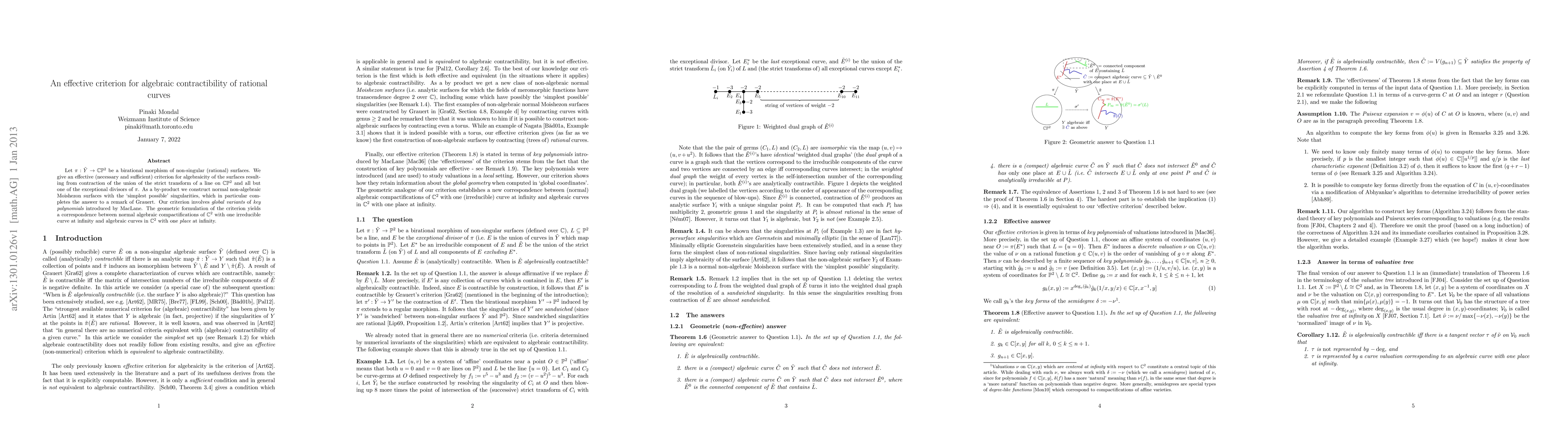 Let f: Y -> CP^2 be a birational morphism of non-singular (rational) surfaces. We give an effective (necessary and sufficient) criterion for algebraicity of the surfaces resulting from contraction of the union of the strict transform of a line on CP^2 and all but one of the exceptional divisors of f. As a by-product we construct normal non-algebraic Moishezon surfaces with the `simplest possible' singularities, which in particular completes the answer to a remark of Grauert. Our criterion involves `global variants' of `key polynomials' introduced by MacLane. The geometric formulation of the criterion yields a correspondence between normal algebraic compactifications of C^2 with one irreducible curve at infinity and algebraic curves in C^2 with one place at infinity.