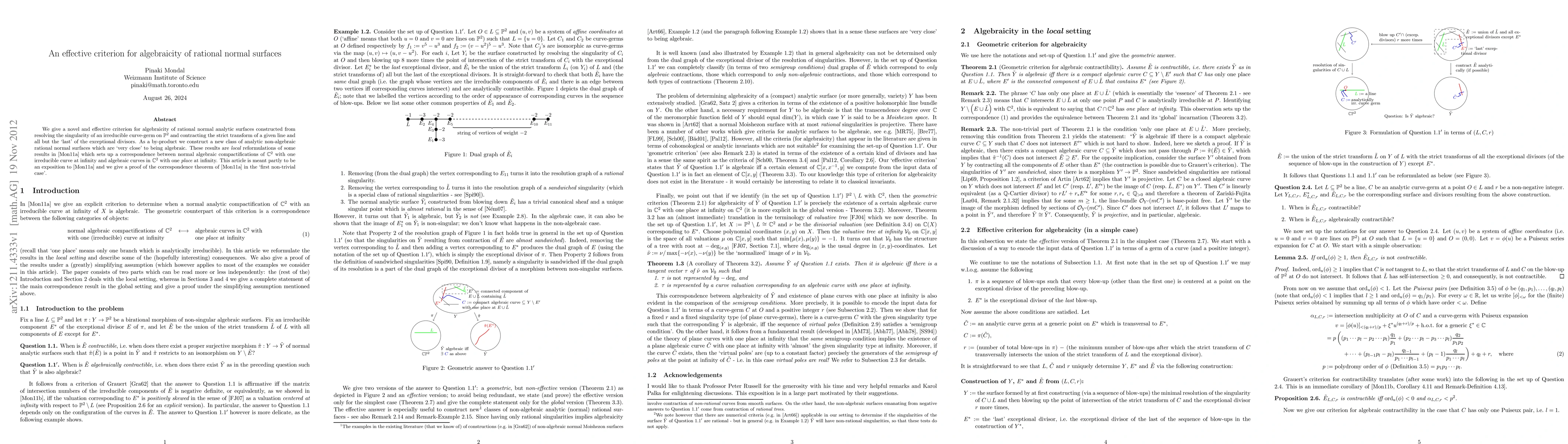 We give a novel and effective criterion for algebraicity of rational normal analytic surfaces constructed from resolving the singularity of an irreducible curve-germ on $CP^2$ and contracting the strict transform of a given line and all but the `last' of the exceptional divisors. As a by-product we construct a new class of analytic non-algebraic rational normal surfaces which are `very close' to being algebraic. These results are local reformulations of some results in (Mondal, 2011) which sets up a correspondence between normal algebraic compactifications of $C^2$ with one irreducible curve at infinity and algebraic curves in $C^2$ with one place at infinity. This article is meant partly to be an exposition to (Mondal, 2011) and we give a proof of the correspondence theorem of (Mondal, 2011) in the `first non-trivial case'.
