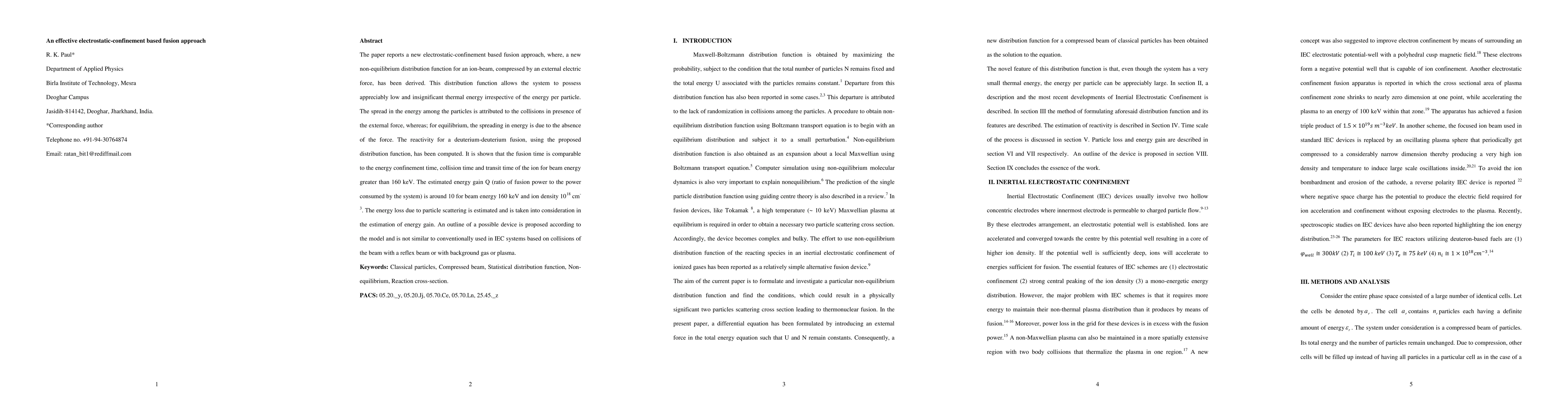 The paper reports a new electrostatic-confinement based fusion approach, where, a new non-equilibrium distribution function for an ion-beam, compressed by an external electric force, has been derived. This distribution function allows the system to possess appreciably low and insignificant thermal energy irrespective of the energy per particle. The spread in the energy among the particles is attributed to the collisions in presence of the external force, whereas; for equilibrium, the spreading in energy is due to the absence of the force. The reactivity for a deuterium-deuterium fusion, using the proposed distribution function, has been computed. It is shown that the fusion time is comparable to the energy confinement time, collision time and transit time of the ion for beam energy greater than 160 keV. The estimated energy gain Q (ratio of fusion power to the power consumed by the system) is around 10 for beam energy 160 keV and ion density 1018 cm-3. The energy loss due to particle scattering is estimated and is taken into consideration in the estimation of energy gain. An outline of a possible device is proposed according to the model and is not similar to conventionally used in IEC systems based on collisions of the beam with a reflex beam or with background gas or plasma.