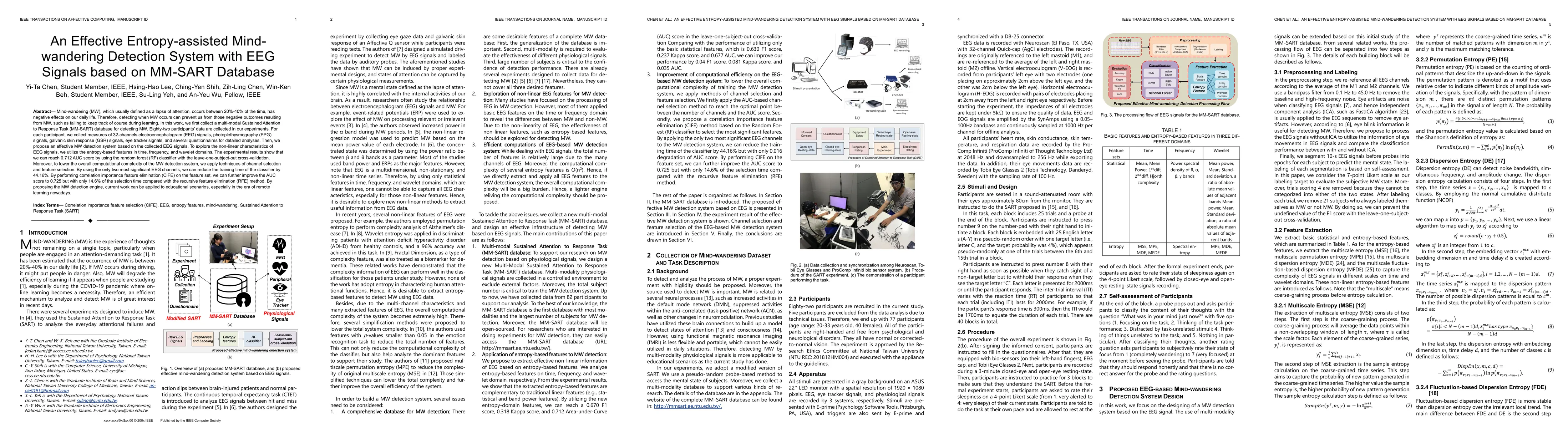 Researchers developed an EEG-based mind-wandering detection system with high accuracy, using entropy features in time, frequency, and wavelet domains to detect mental lapses in 82 participants. The system achieved a 0.712 AUC score and was optimized for computational efficiency through channel selection and feature elimination.