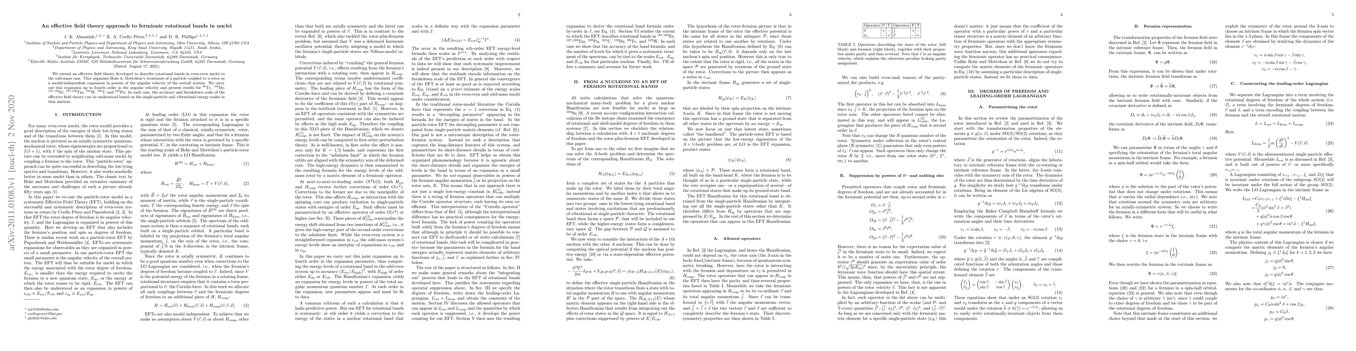 This paper extends an effective field theory to describe fermionic rotational bands in odd-mass nuclei, organizing the treatment of a particle coupled to a rotor as a model-independent expansion. The study presents results up to fourth order in angular velocity for several isotopes, demonstrating the accuracy and breakdown scale based on the nucleus's single-particle and vibrational energy scales.