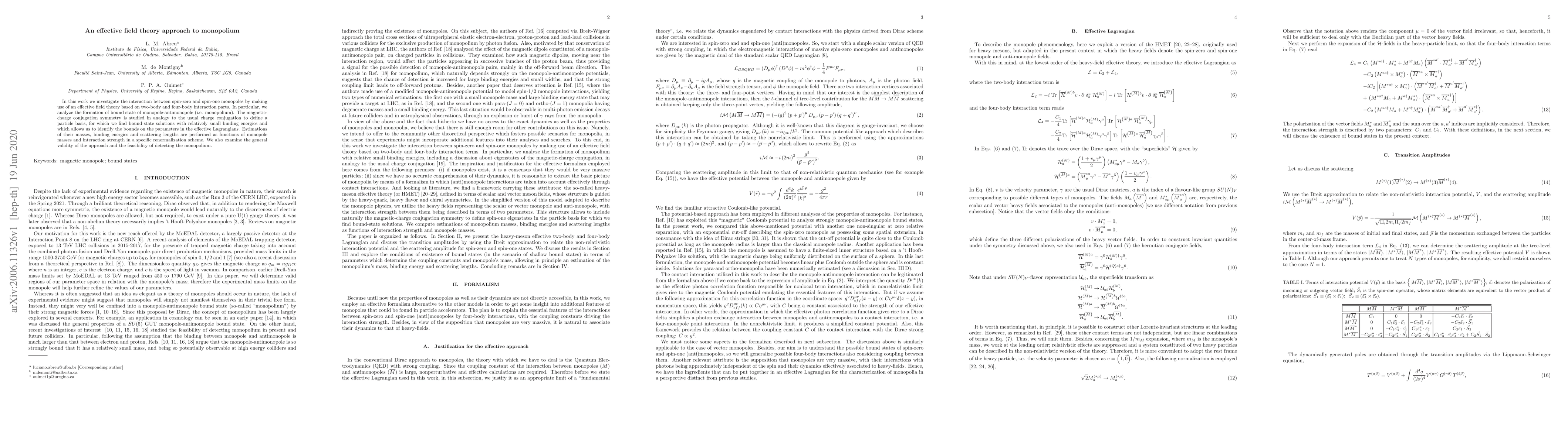 This paper employs an effective field theory to study the interaction between spin-zero and spin-one monopoles, focusing on the formation of monopole-antimonopole bound states (monopolium). It identifies bound-state solutions and estimates their masses, binding energies, and scattering lengths, while discussing the general validity and detectability of these states.