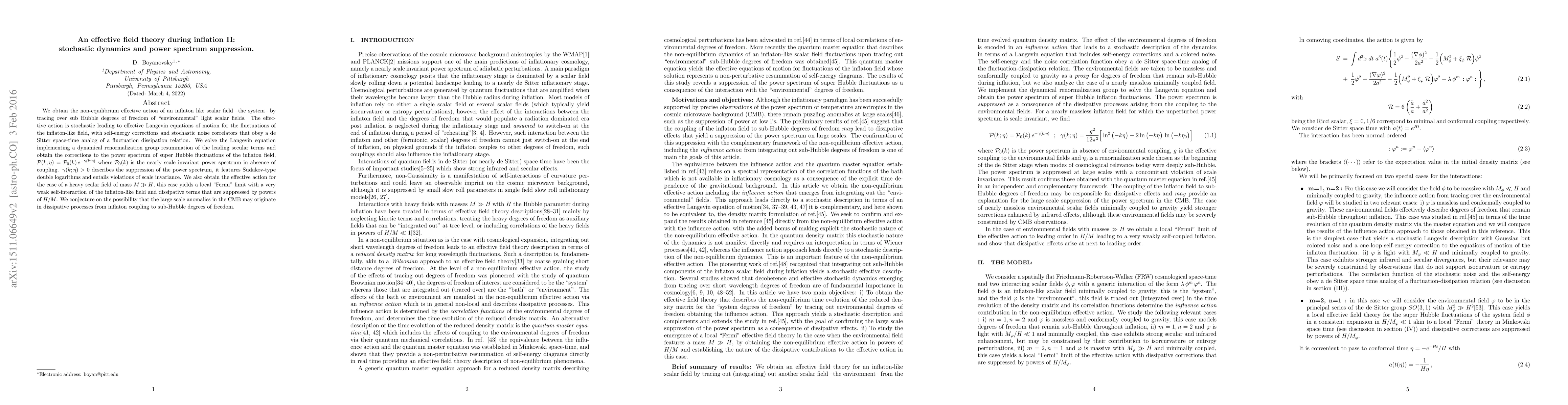 We obtain the non-equilibrium effective action of an inflaton like scalar field --the system-- by tracing over sub Hubble degrees of freedom of "environmental" light scalar fields. The effective action is stochastic leading to effective Langevin equations of motion for the fluctuations of the inflaton-like field, with self-energy corrections and stochastic noise correlators that obey a de Sitter space-time analog of a fluctuation dissipation relation. We solve the Langevin equation implementing a dynamical renormalization group resummation of the leading secular terms and obtain the corrections to the power spectrum of super Hubble fluctuations of the inflaton field, $\mathcal{P}(k;\eta) = \mathcal{P}_0(k)\,e^{-\gamma(k;\eta)}$ where $\mathcal{P}_0(k)$ is the nearly scale invariant power spectrum in absence of coupling. $\gamma(k;\eta)>0$ describes the suppression of the power spectrum, it features Sudakov-type double logarithms and entails violations of scale invariance. We also obtain the effective action for the case of a heavy scalar field of mass $ M \gg H$, this case yields a local "Fermi" limit with a very weak self-interaction of the inflaton-like field and dissipative terms that are suppressed by powers of $H/M$. We conjecture on the possibility that the large scale anomalies in the CMB may originate in dissipative processes from inflaton coupling to sub-Hubble degrees of freedom.