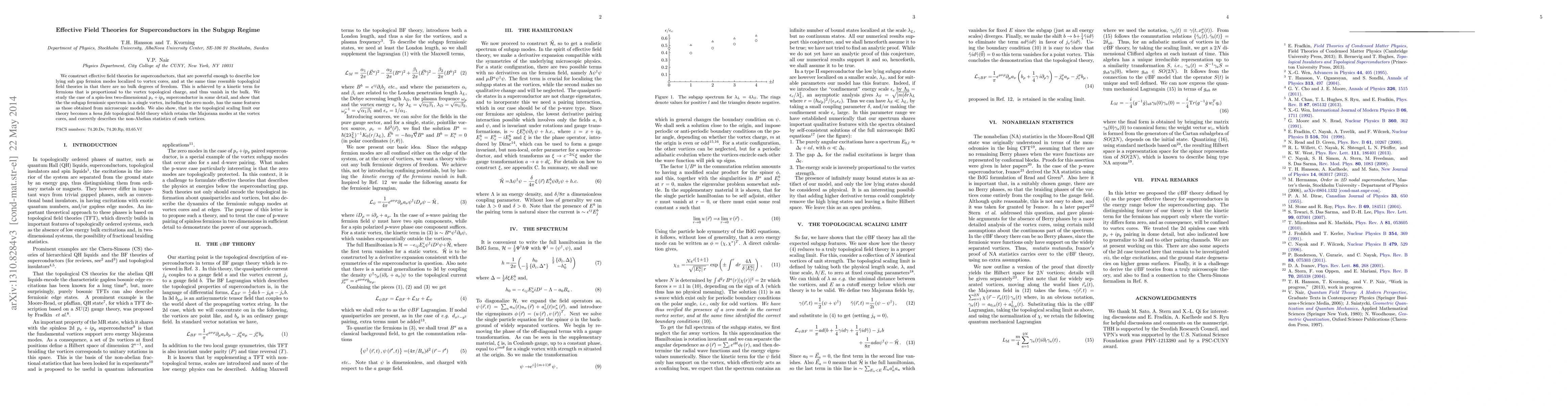 This paper constructs an effective field theory for spinless $p_x + ip_y$ superconductors, focusing on low-lying subgap fermion modes near vortex cores. The theory eliminates bulk degrees of freedom and accurately captures the subgap fermionic spectrum, including zero modes, mirroring results from microscopic models.