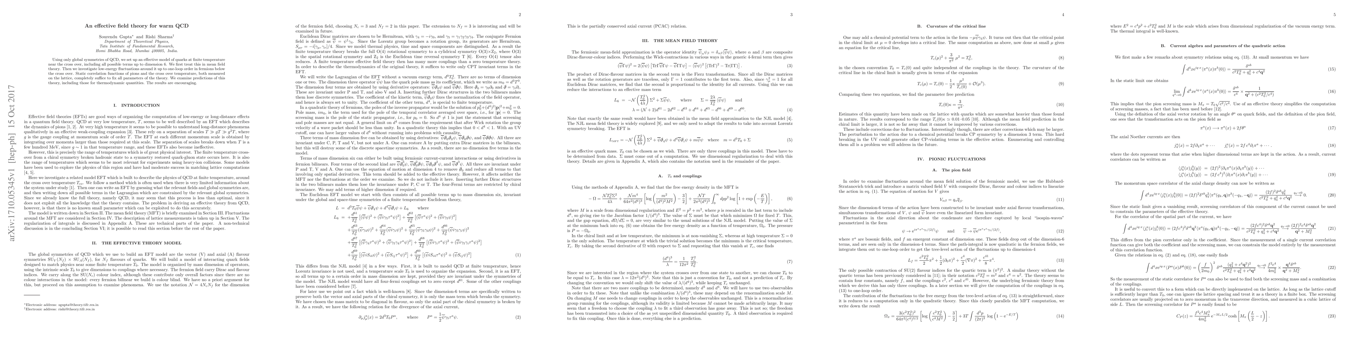 Using only global symmetries of QCD, we set up an effective model of quarks at finite temperature near the cross over, including all possible terms up to dimension 6. We first treat this in mean field theory. Then we investigate low-energy fluctuations around it up to one-loop order in fermions below the cross over. Static correlation functions of pions and the cross over temperature, both measured on the lattice, completely suffice to fix all parameters of the theory. We examine predictions of this theory, including those for thermodynamic quantities. The results are encouraging.