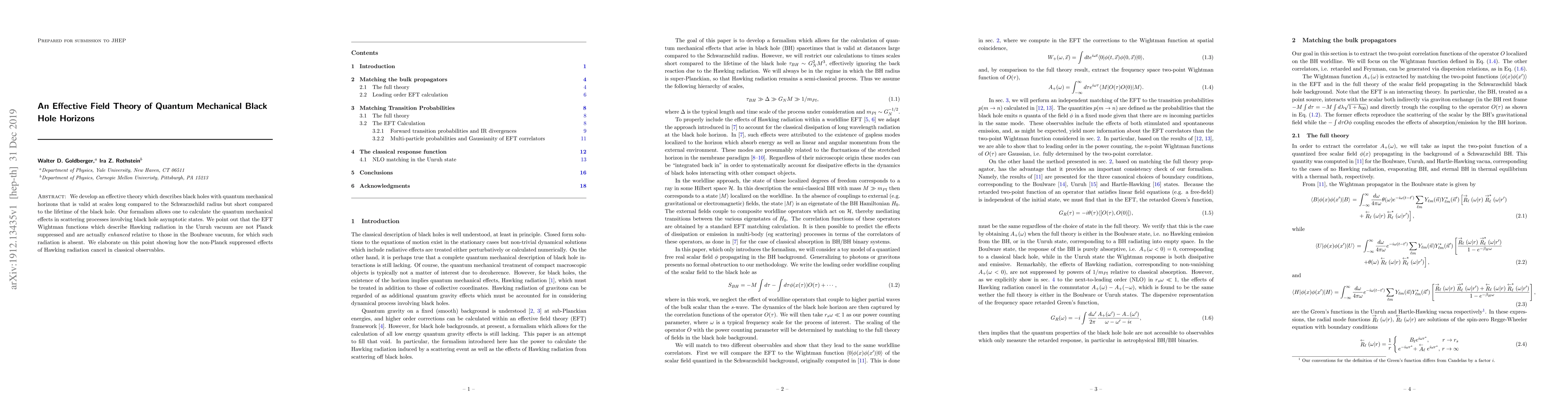 We develop an effective theory which describes black holes with quantum mechanical horizons that is valid at scales long compared to the Schwarzschild radius but short compared to the lifetime of the black hole. Our formalism allows one to calculate the quantum mechanical effects in scattering processes involving black hole asymptotic states. We point out that the EFT Wightman functions which describe Hawking radiation in the Unruh vacuum are not Planck suppressed and are actually {\it enhanced} relative to those in the Boulware vacuum, for which such radiation is absent. We elaborate on this point showing how the non-Planck suppressed effects of Hawking radiation cancel in classical observables.