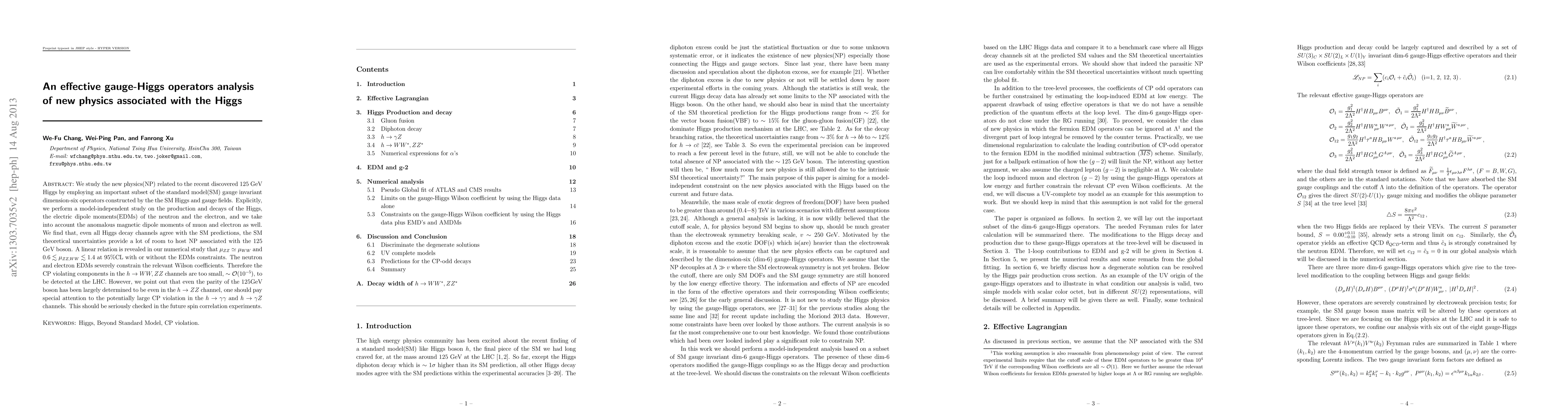 We study the new physics(NP) related to the recent discovered 125 GeV Higgs by employing an important subset of the standard model(SM) gauge invariant dimension-six operators constructed by the the SM Higgs and gauge fields. Explicitly, we perform a model-independent study on the production and decays of the Higgs, the electric dipole moments(EDM) of the neutron and the electron, and we take into account the anomalous magnetic dipole moments of muon and electron as well. We find that, even all Higgs decay channels agree with the SM predictions, the SM theoretical uncertainties provide a lot of room to host NP associated with the 125 GeV boson. A linear relation is revealed in our numerical study that $\mu_{ZZ}\simeq \mu_{WW}$ and $ 0.6 \lesssim \mu_{ZZ,WW} \lesssim 1.4$ at 95% CL with or without the EDM's constraints. The neutron and electron EDM's severely constrain the relevant Wilson coefficients. Therefore the CP violating components in the $h\rightarrow WW, ZZ$ channels are too small, $\sim{\cal O}(10^{-5})$, to be detected at LHC. However, we point out that even the parity of the 125GeV boson has been largely determined to be even in the $h\to ZZ$ channel, one should pay special attention to the potentially large CP violation in the $h\to \gamma\gamma$ and $h\to \gamma Z$ channels. This should be seriously checked in the future spin correlation experiments.