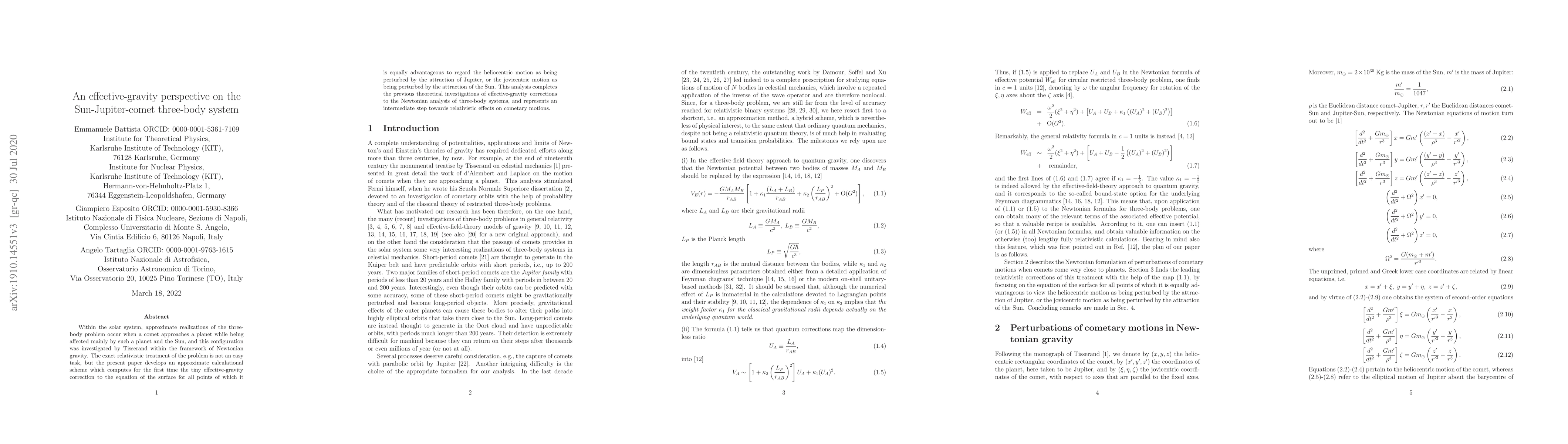 A new method is introduced to calculate effective-gravity corrections in a three-body system involving the Sun, Jupiter, and a comet, providing an intermediate step towards relativistic effects on cometary motions.