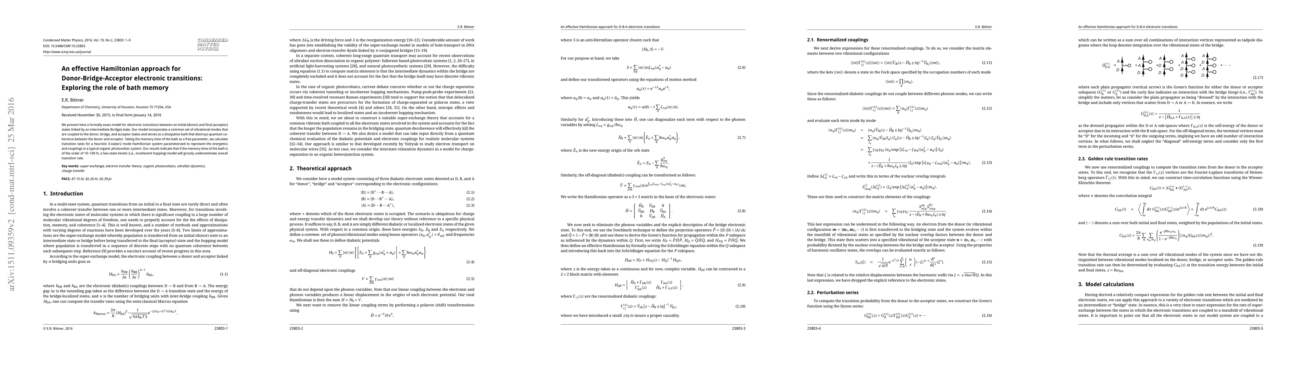 We present here a formally exact model for electronic transitions between an initial (donor) and final (acceptor) states linked by an intermediate (bridge) state. Our model incorporates a common set of vibrational modes that are coupled to the donor, bridge, and acceptor states and serves as a dissipative bath that destroys quantum coherence between the donor and acceptor. Taking the memory time of the bath as a free parameter, we calculate transition rates for a heuristic 3-state/2 mode Hamiltonian system parameterized to represent the energetics and couplings in a typical organic photovoltaic system. Our results indicate that if the memory time of the bath is of the order of 10-100 fs, a two-state kinetic (i.e., incoherent hopping) model will grossly underestimate overall transition rate.